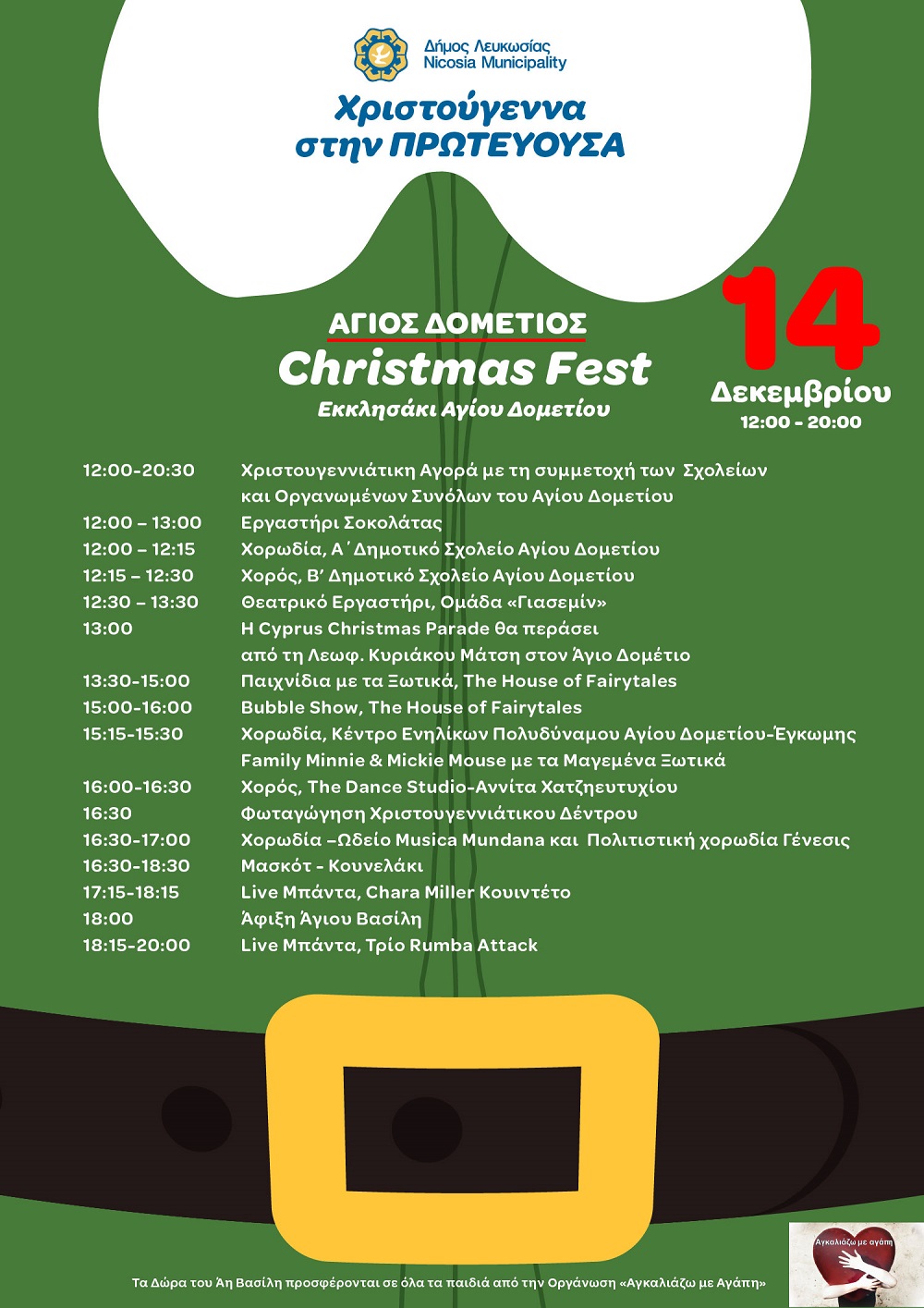 Τα «Χριστούγεννα στην Πρωτεύουσα» συνεχίζονται με ακόμη μία μεγάλη γιορτή, αυτή τη φορά στον Άγιο Δομέτιο. Την Κυριακή 14 Δεκεμβρίου 2025, από τις 12:00 έως τις 20:30, το Εκκλησάκι Αγίου Δομετίου μεταμορφώνεται σε έναν ζεστό, γιορτινό χώρο με μουσική, χρώματα και δραστηριότητες για όλη την οικογένεια.