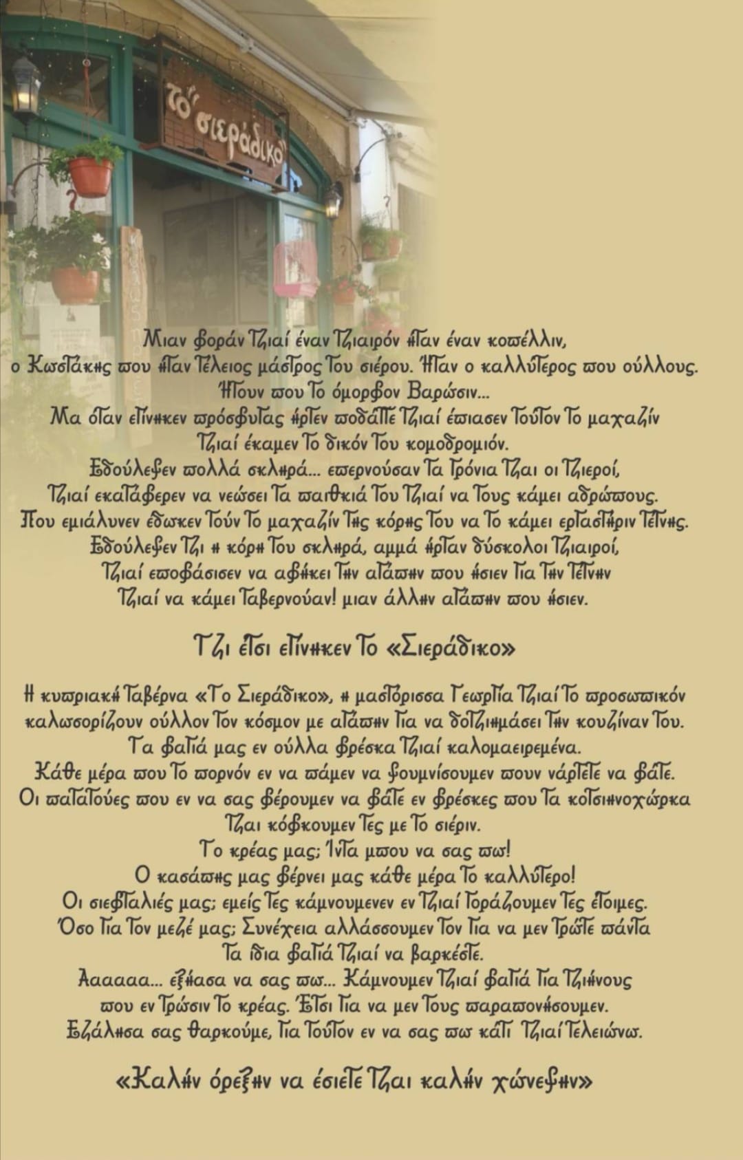 Σήμερα, το Σιεραδικό δεν είναι απλώς ένα σημείο γεύσης. Είναι ένα ζωντανό κομμάτι της μνήμης, ένα φαγάδικο με ψυχή και ιστορία, που σε καλεί όχι μόνο να φας καλά, αλλά και να νιώσεις σαν στο σπίτι σου.