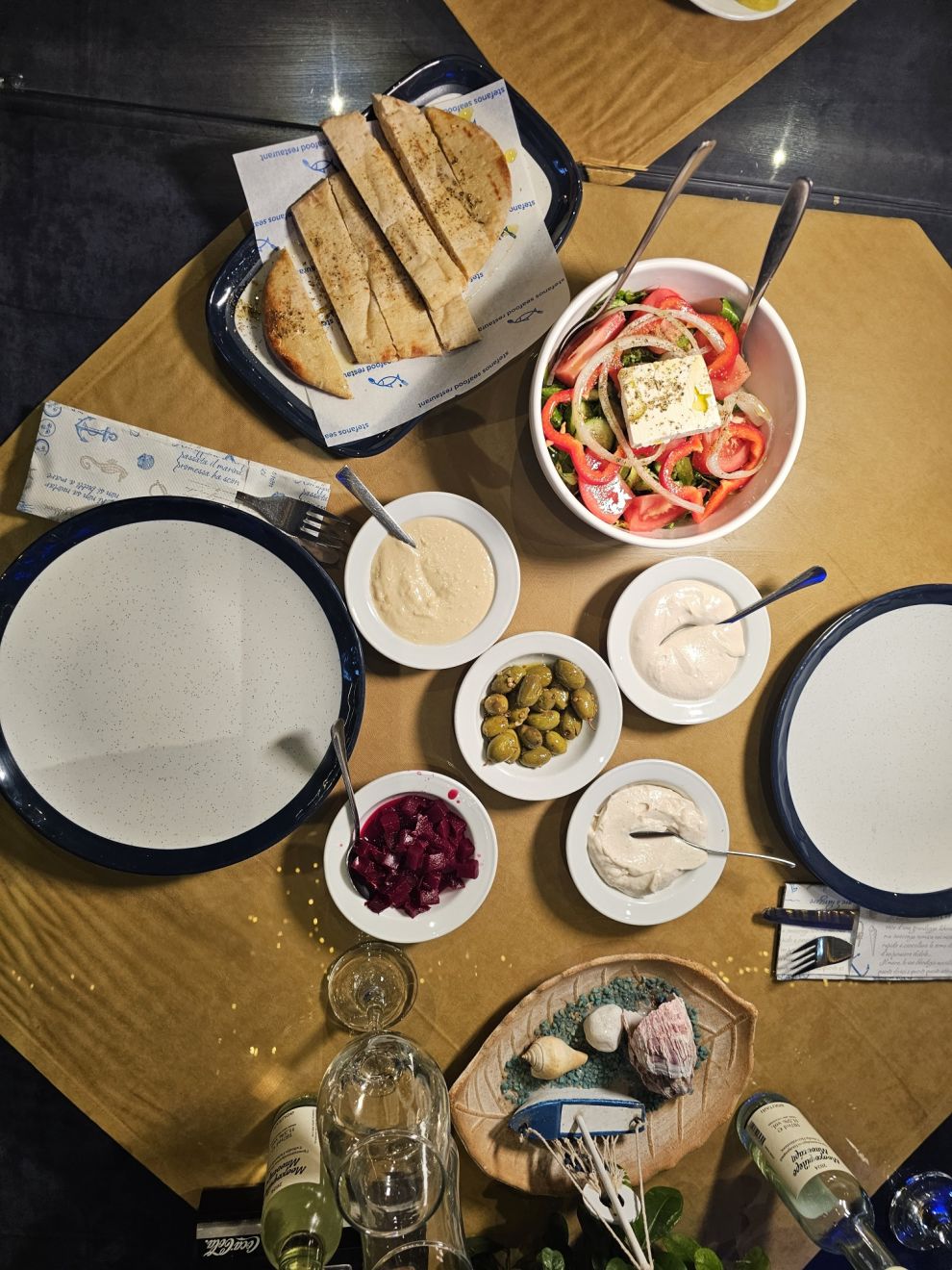 Στη συνέχεια ακολούθησαν χωριάτικη σαλάτα, ποικιλία ορεκτικών και τραγανές πατάτες.