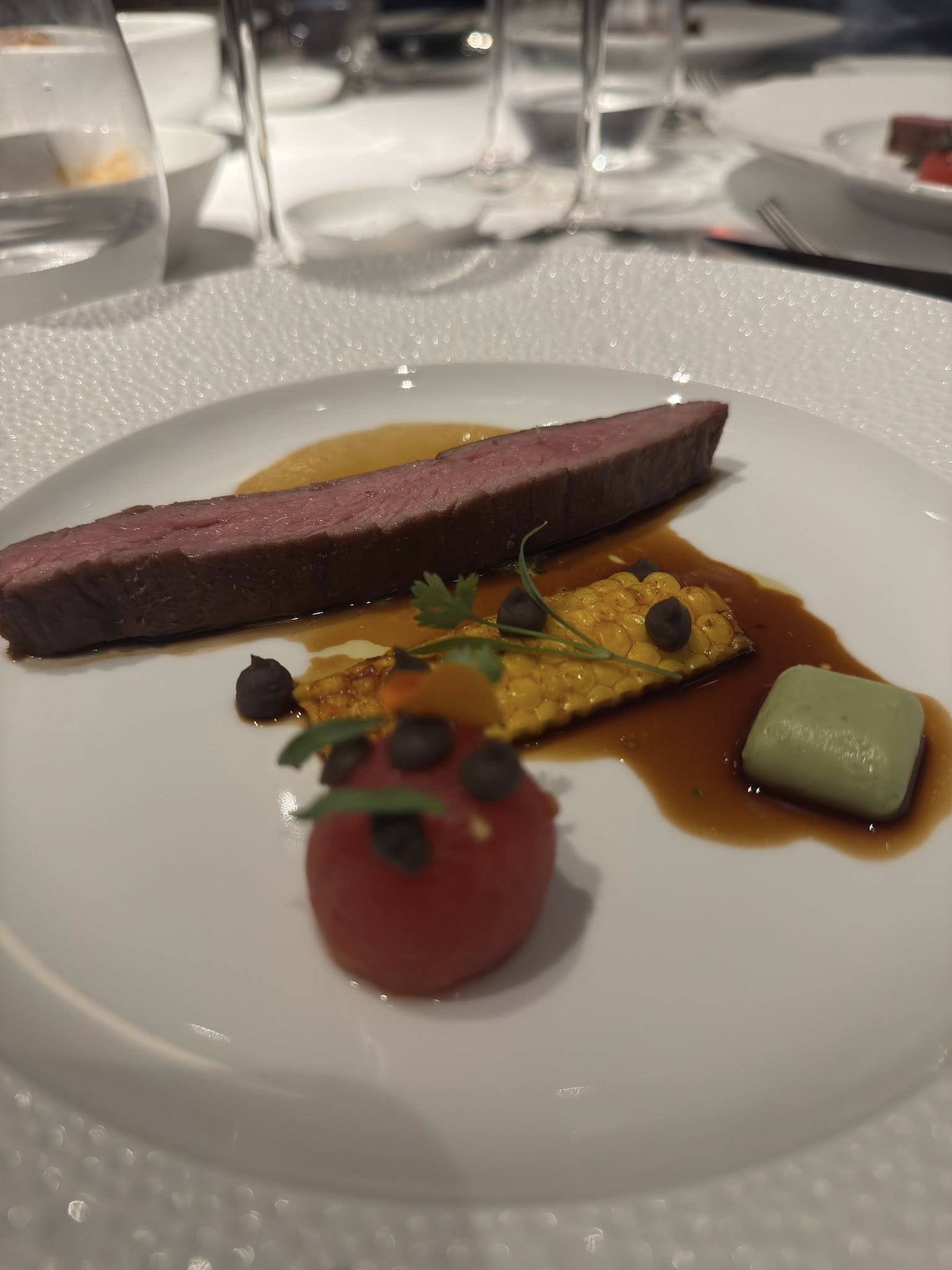 Ανάμεσα τους ξεχώρισα το Dakos με φέτα, ντομάτα και ελιά, μια ελληνική πινελιά σε μοντέρνα εκδοχή το οποίο κατάφερε να αναδείξει όλα τα στοιχεία και τις γεύσεις της χωριάτικης σαλάτας στον υπερθετικό τους βαθμό, καθώς και το US flank steak με αβοκάντο, καλαμπόκι και μαύρο φασόλι από την Αργεντινή, που απογείωσε το μενού με την ένταση και τη ζωντάνια του. Τέλος το επιδόρπιο, το Karaz με κεράσι, φιστίκι και ροδόνερο, ήταν η πιο γλυκιά και αρωματική αυλαία.