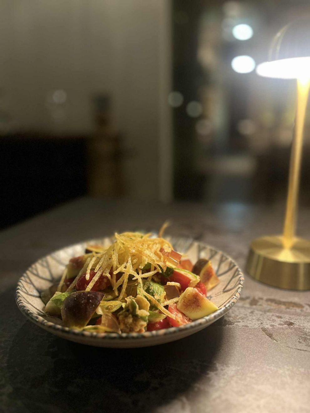 Ο σεφ λοιπόν μάς πρότεινε ντοματοσαλάτα (με σύκα, ζελέ μαύρου τσαγιού και φρέσκο δυόσμο), βοδινό ταρτάρ (με παγωτό μουστάρδας Ντιζόν, κουλούμπρα, κρόκο αυγού και κράκερ γλυσταρκάς), παντζάρια ψημένα σε αλάτι (με γλυκοπατατάτα, γάλα μακαντέμια, σως έψιμα και χούμους), τον επικό πλέον ντολμά θαλασσινών (με λευκές γαρίδες, χταπόδι, μύδια και αυγολέμονο ψαριού), χαλούμι ποσέ (με ταρτάρ παντζαριού, καπνιστά αμύγδαλα, τραγανή μαύρη ελιά και σως καμένου μελιού), ριζότο με κρόκο Κοζάνης (με λευκές γαρίδες, πουρέ μάραθου και τουρσί πάλκαπα), χοιρινό αφέλια τερίνα (με πουργουρότο, αφρός χαλουμιού και ξερό κόλιανδρο), αλλά και μια δούκισσα (με μαύρη σοκολάτα με κρέμα μίσο, σορμπέ μπανάνας και καραμελωμένη μπανάνα).