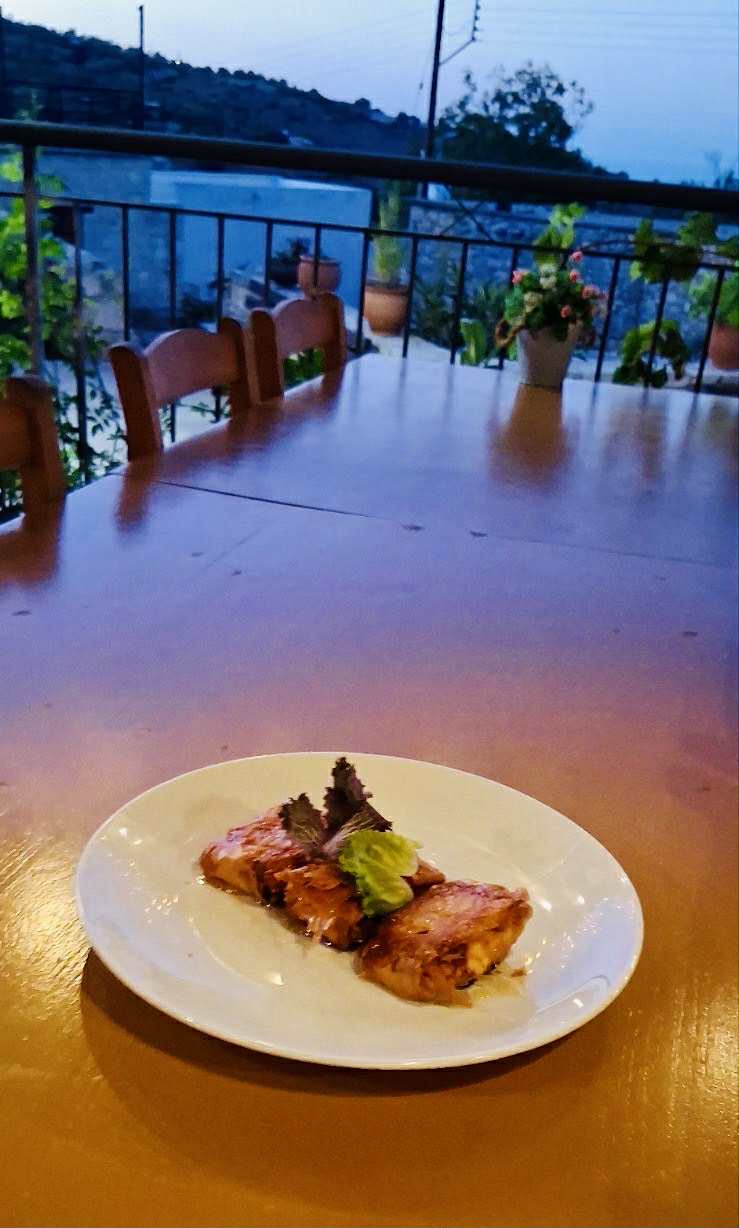 Χαλλούμι αιγοπρόβειο (από τη Δρούσεια) τυλιγμένο σε φύλο κρούστας, το οποίο ψήνεται στον φούρνο με αιγοπρόβειο βούτυρο. Σερβίρεται με μέλι του δάσους, που παρασκευάζει ένας κύριος ο οποίος διαθέτει μελίσσια στο δάσος της Πάφου. Σημαντικό είναι να πούμε πως, σε κάθε χαλλούμι, πριν τυλιχτεί στο φύλλο κρούστας, προηγουμένως μπαίνει ένα φύλλο δυόσμου φρέσκο.
