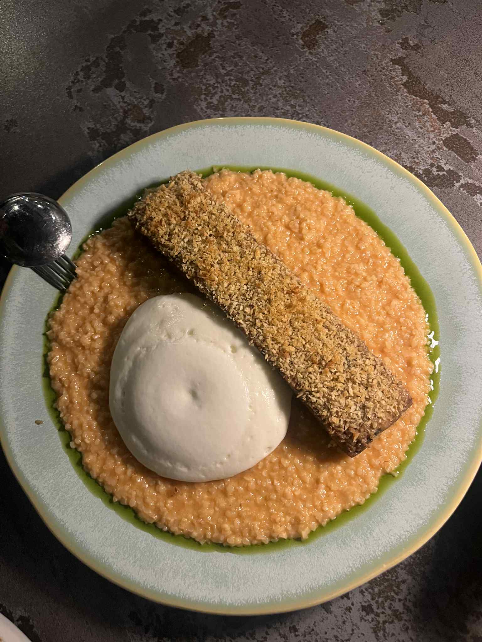 Στο ίδιο εστιατόριο, μέσω του νέου μενού με τη sharing φιλοσοφία και την αδιάκοπη προσπάθεια να αναδείξει τη σύγχρονη κυπριακή κουζίνα, ο σεφ Σουλιώτης ενσωμάτωσε άλλη μια συνταγή με πρωταγωνιστή το χαλλούμι, με το όνομα «χοιρινό αφέλια τερίνα». Η λογική αφορά στα αφέλια, ένα απόλυτα κυπριακό έδεσμα, εξ ου και το κρέας συνοδεύεται με πουργουρότο, ξερό κόλιανδρο και αφρό χαλουμιού -μια παρασκευή που σπάνια συναντάμε σε κυπριακά εστιατόρια.