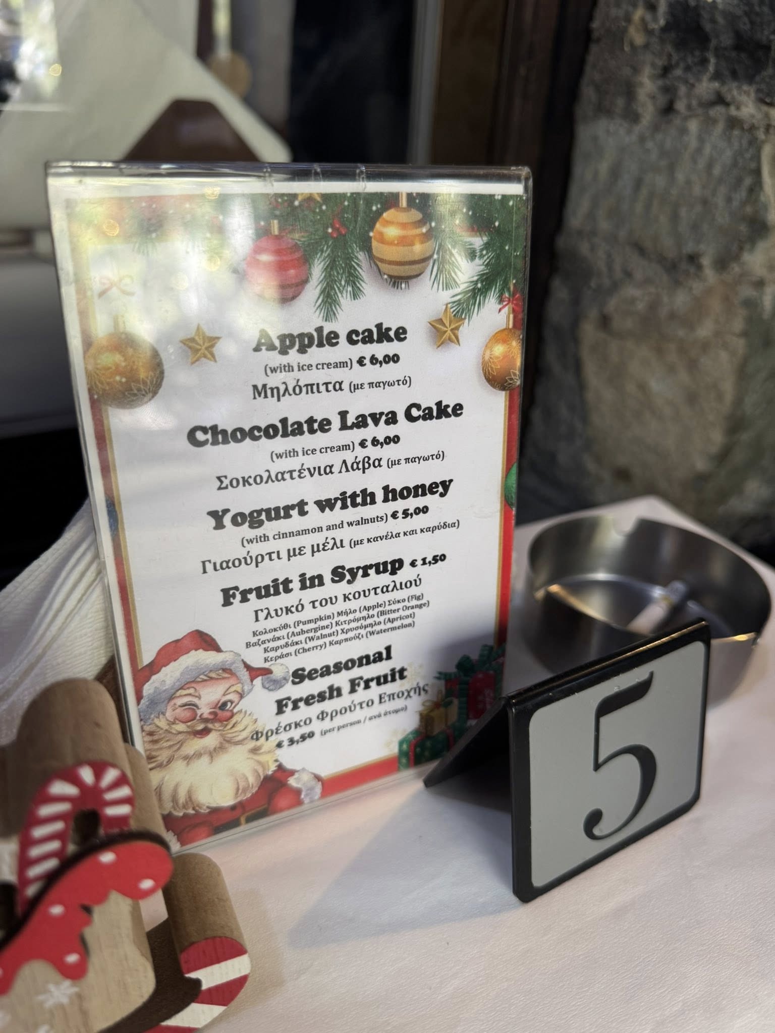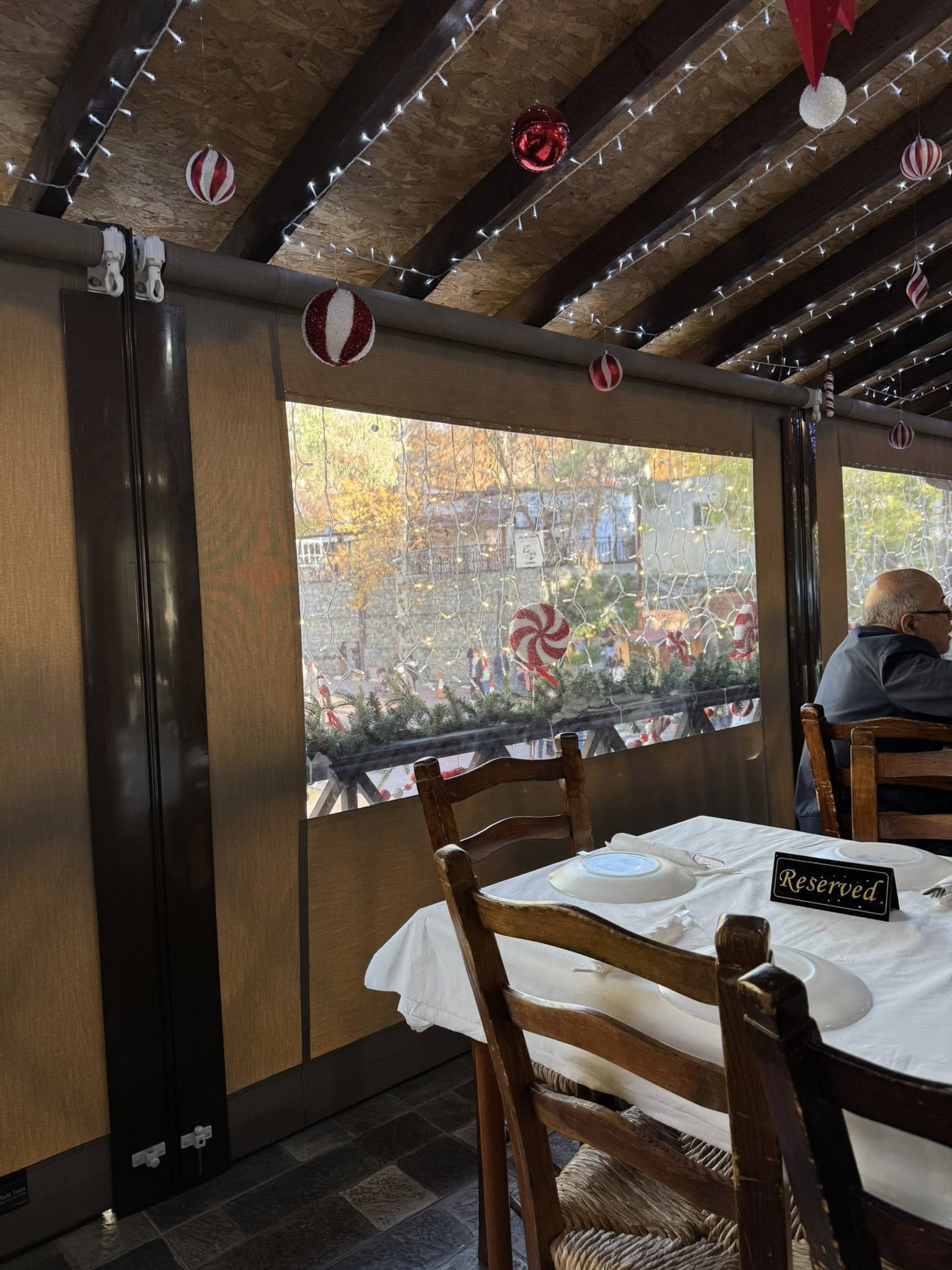 Τραπέζι, ευτυχώς, είχαμε κλείσει από την προηγούμενη μέρα, καθώς επικρατούσε το αδιαχώρητο. Καθίσαμε στη βεράντα, η οποία ήταν πλήρως εξοπλισμένη με μεγάλες σόμπες, διατηρώντας τον χώρο ζεστό και άνετο.
