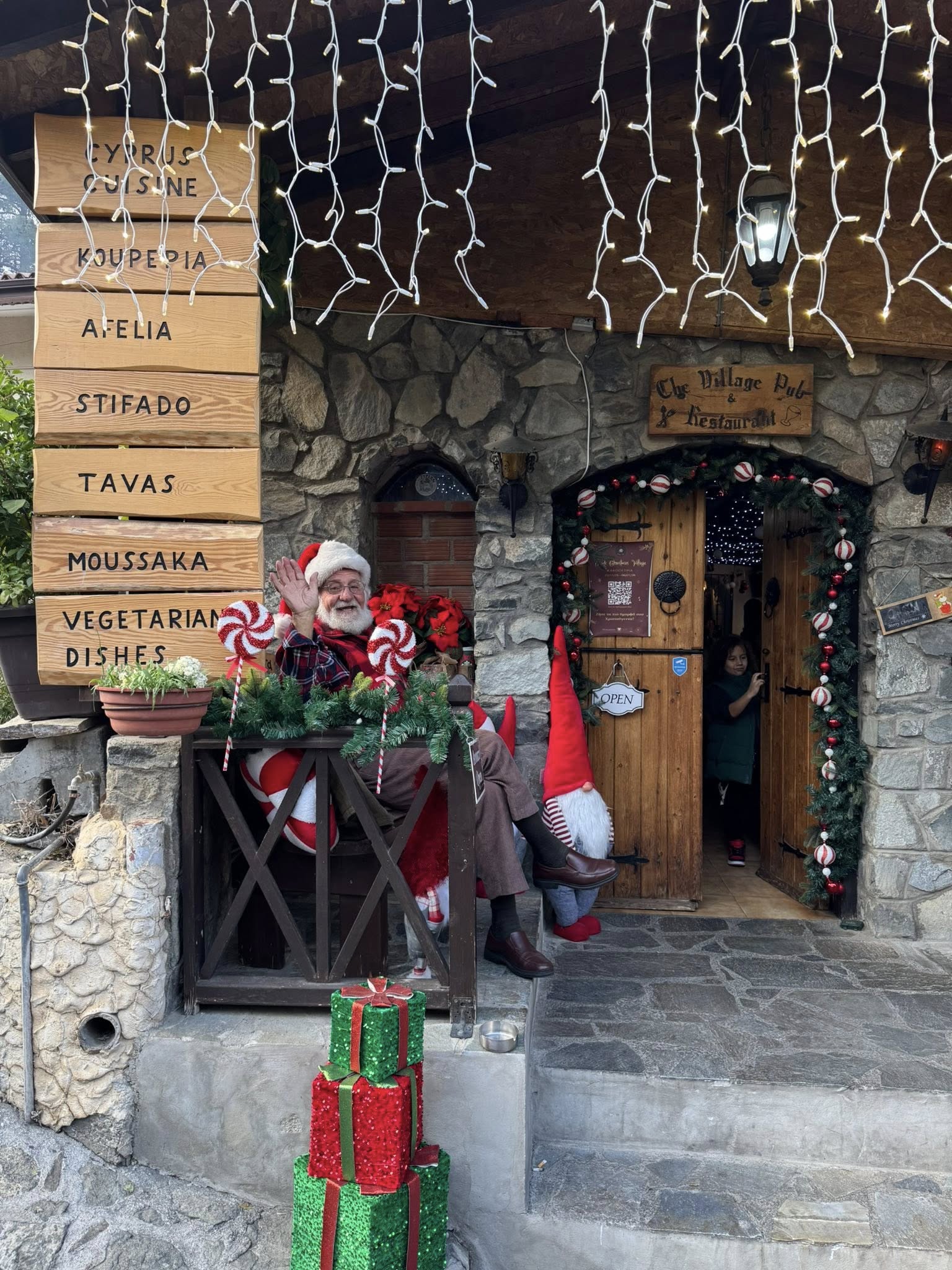 Βρεθήκαμε λοιπόν στην Κακοπετριά εν μέσω των γιορτών, περπατήσαμε τα γραφικά στενά του χωριού και κάναμε στάση στο The Village Pub. Στην είσοδο μας υποδέχτηκε ένας χαμογελαστός Άγιος Βασίλης, ενώ το τζάκι έκαιγε ασταμάτητα, προσθέτοντας ακόμη περισσότερη θαλπωρή στην ήδη γιορτινή ατμόσφαιρα.