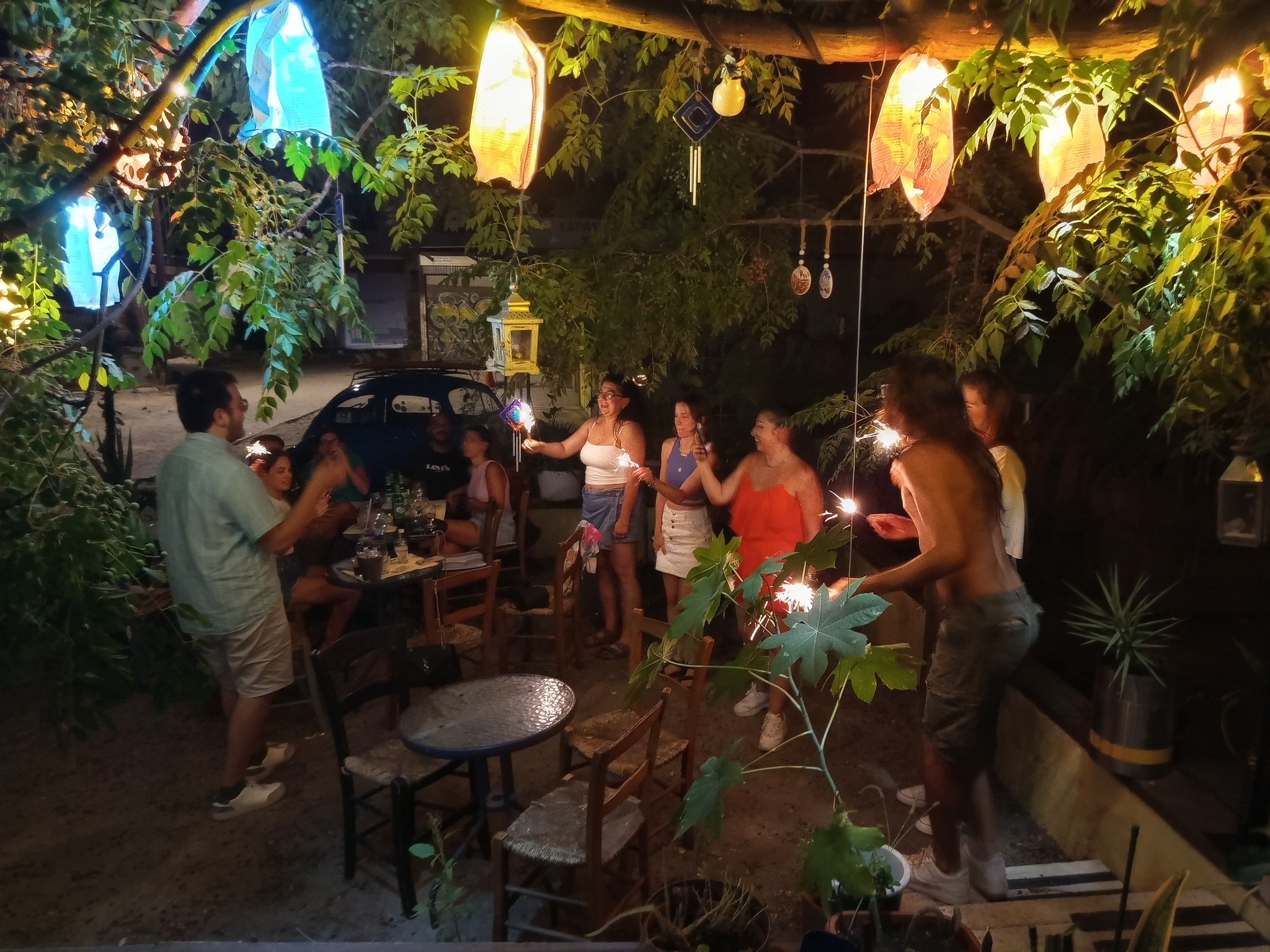 Για χρόνια η αυλή ήταν ένα παραμελημένο χωράφι γεμάτο μπάζα. Ο Στέλιος, ιδιοκτήτης του εστιατορίου, αποφάσισε μαζί με έναν φίλο του –ειδικό στη διαμόρφωση κήπων– να της δώσει ζωή. Με λουλούδια, φυτά και προσεγμένο σχεδιασμό, το παλιό οικόπεδο μετατράπηκε σε μια μικρή όαση μέσα στην πόλη.