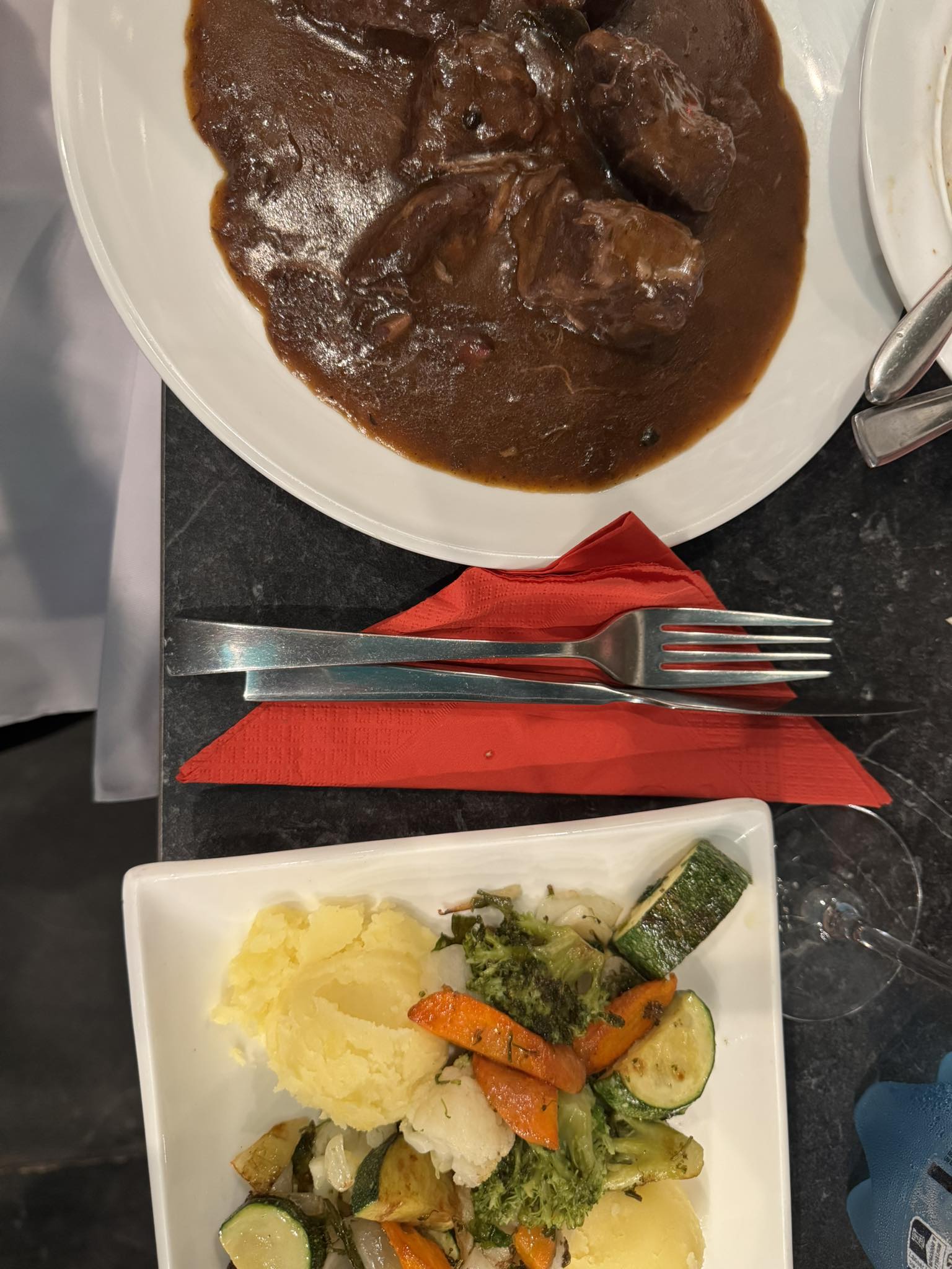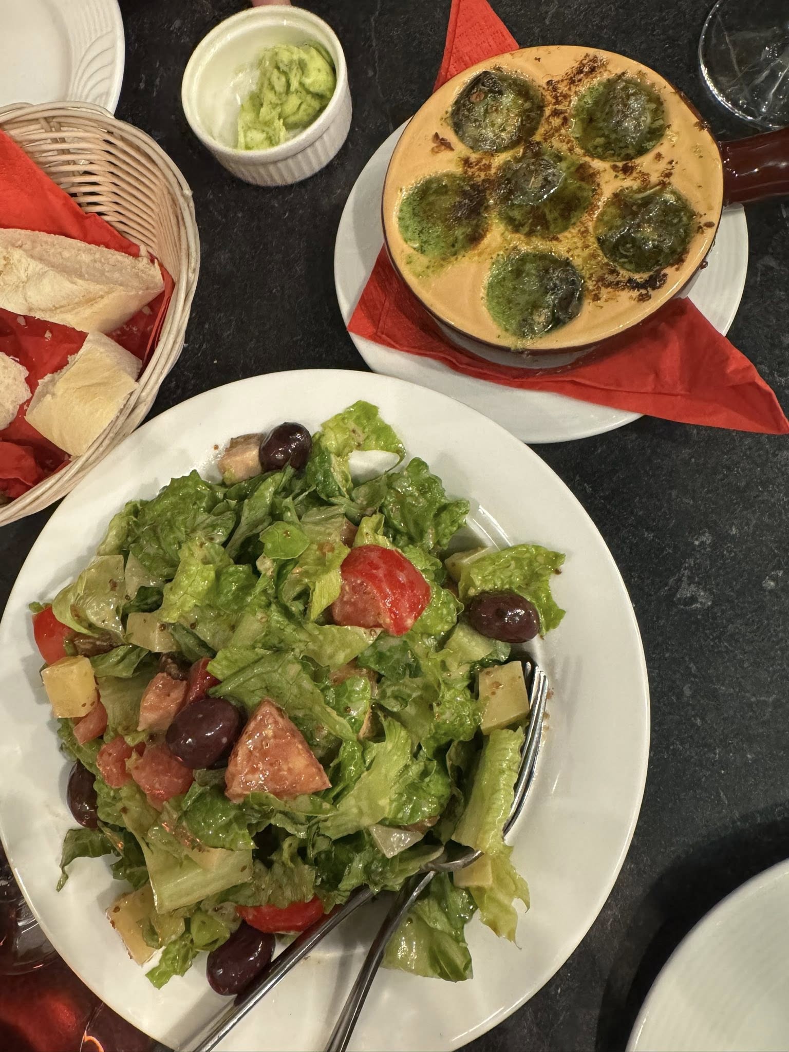 Το αίσθημα αυτό συνεχίστηκε και με τα φαγητά που έφτασαν στο τραπέζι. Ξεκίνησα με σαλιγκάρια Βουργουνδίας με σκόρδο και βούτυρο, σερβιρισμένα σε ένα ζεστό, πήλινο μπολ. Ακολούθησε παριζιάνικη σαλάτα, φρέσκια και ισορροπημένη. Το κυρίως πιάτο μου ήταν μοσχάρι Βουργουνδίας, μαριναρισμένο και μαγειρεμένο στην κατσαρόλα με κόκκινο κρασί, καρότα, κρεμμύδι, ντομάτα και σκόρδο, συνοδευόμενο από αυθεντικό πουρέ πατάτας και λαχανικά.