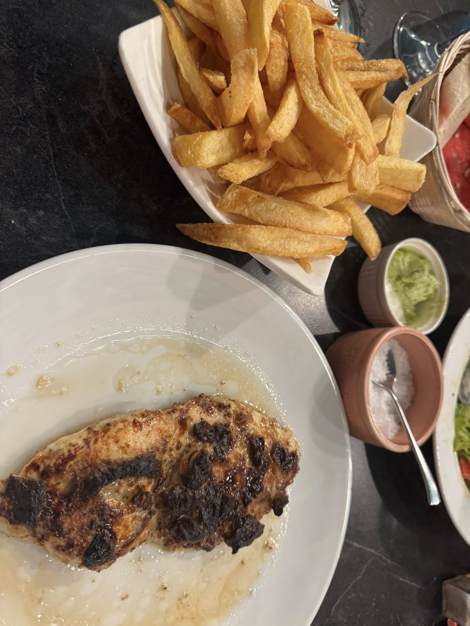 Η παρέα μου παρήγγειλε στήθος κοτόπουλου μαριναρισμένο σε γιαούρτι και μπαχαρικά, το οποίο ήταν εξίσου γευστικό, με πλούσια υφή και άρωμα. Οι τηγανητές πατάτες που ήρθαν ξεχωριστά είχαν σαφώς γαλλική εσάνς και έδεναν τέλεια με τα υπόλοιπα πιάτα.