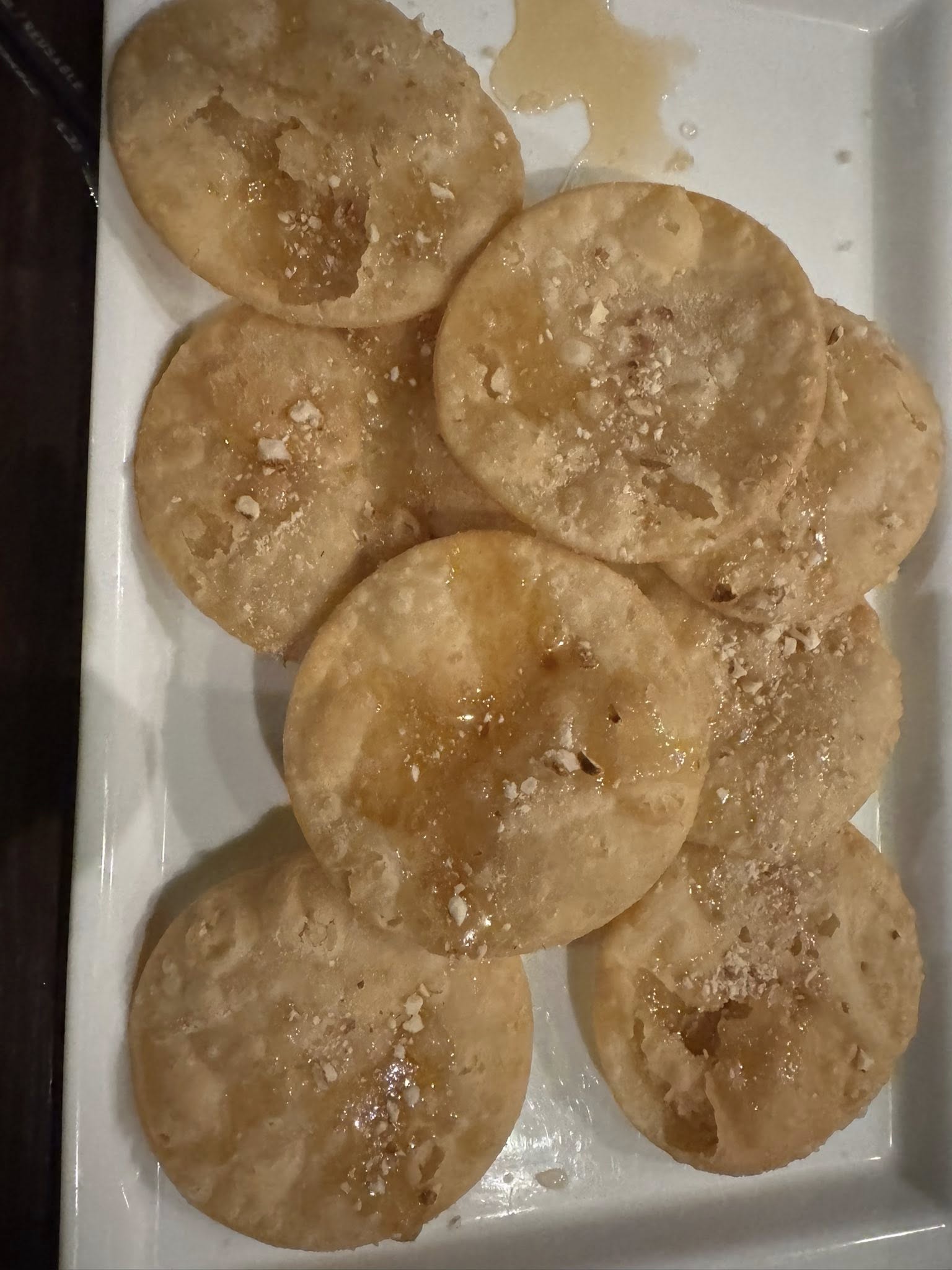 Το παραδοσιακό κέρασμα δεν έλειψε: δροσερό καρπούζι με μήλα και πορτοκάλια και διπλόπιττες με μέλι που θύμισαν εκείνες που έφτιαχνε η γιαγιά μου.