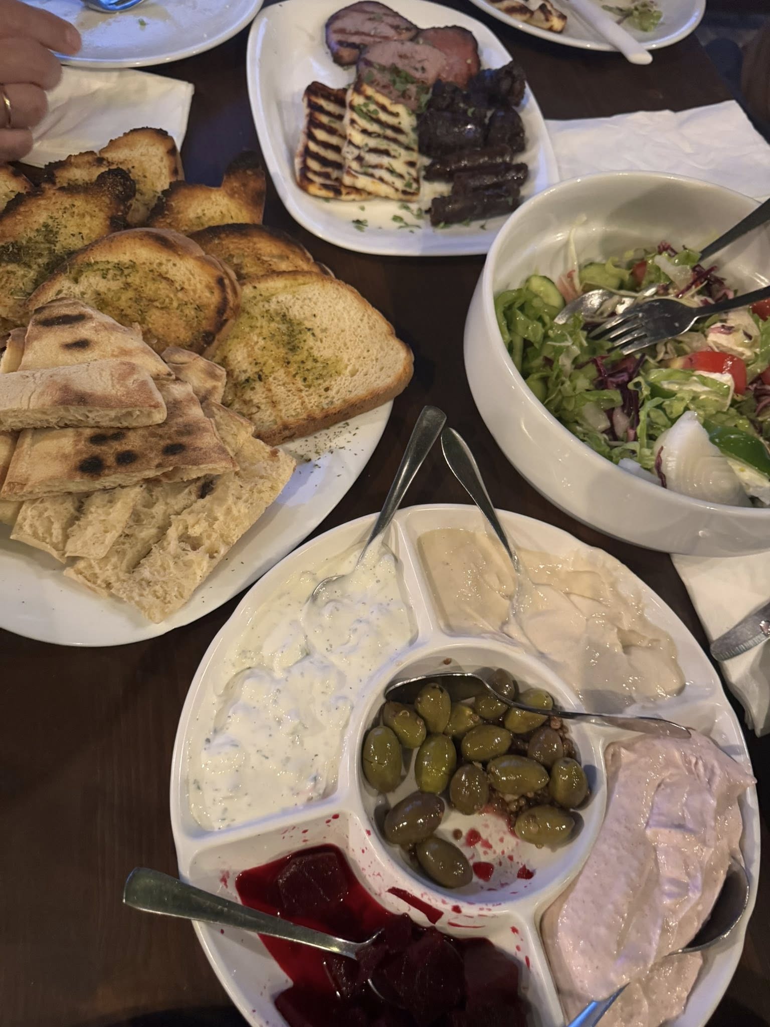 Η δροσερή αυλή, πλαισιωμένη από δέντρα και φυσική σκιά, μας υποδέχτηκε ένα όμορφο Σαββατόβραδο, θυμίζοντάς μας γιατί αγαπάμε τόσο πολύ τα καλοκαίρια. Καθήσαμε με την παρέα σε ένα ακριανό τραπέζι, το οποίο δεν άργησε να γεμίσει με ορεκτικά: ψημένα ψωμάκια και πίτες με λαδορίγανη, χαλούμι, λουκάνικα και μπέικον, αλοιφές και ελιές.