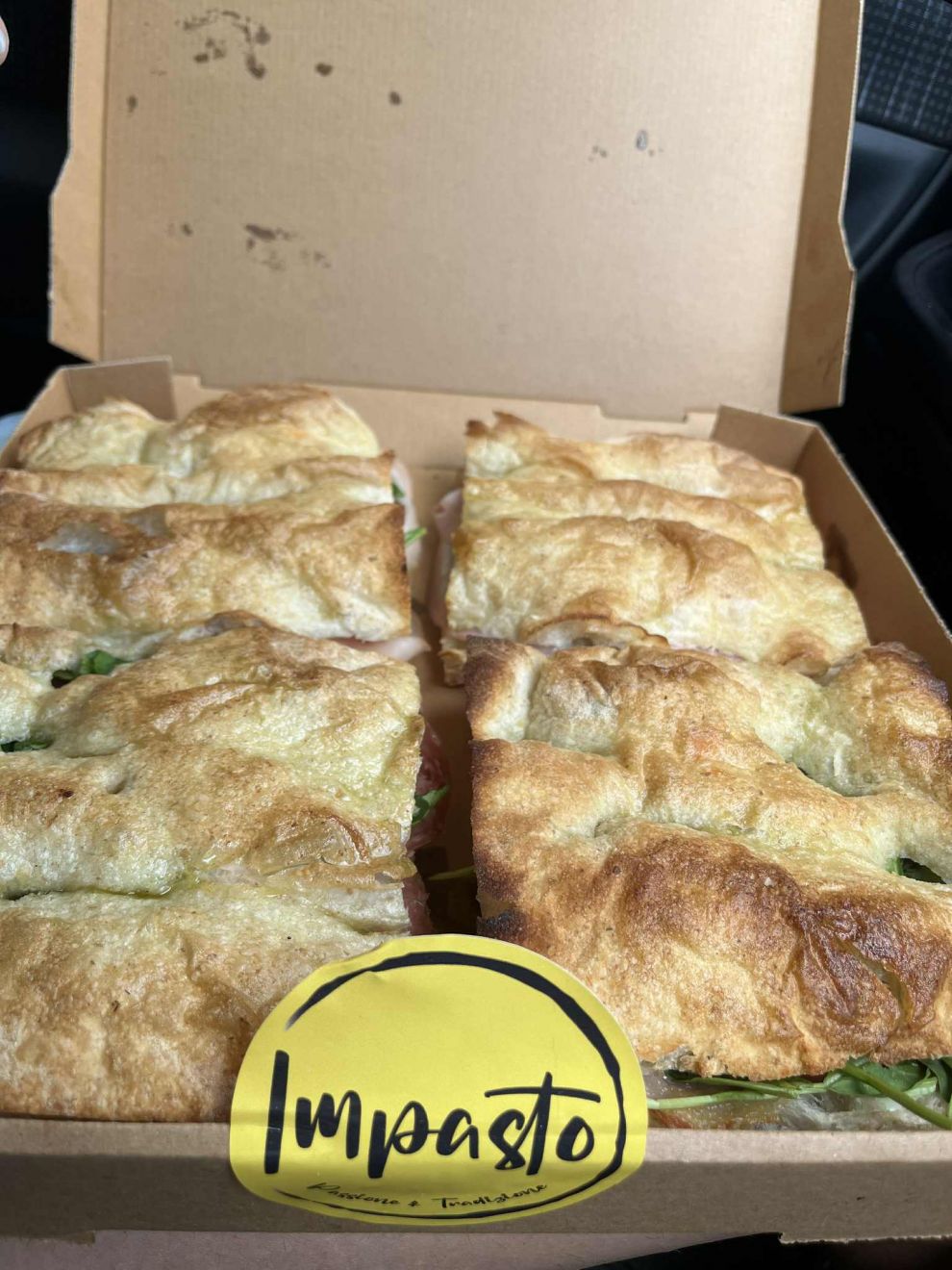 Μη ξέροντας τι να παραγγείλουμε μιας και στη βιτρίνα φαίνονταν όλα νόστιμα και λαχταριστά, πήραμε το La Franci με γαλοπούλα, ricotta, ντομάτα και ρόκα (€7.50), το Fiorentina με fennel salami, pecorino και ρόκα (€7.50), το La Donatello με pancetta, ημίσκληρο τυρί taleggio, μέλι και σπανάκι (€8.50), αλλά και το La Bolognese με mortadella, pesto χαλεπιανών και buratta (€8.50). Ο Maurizio τα ζέστανε στον ειδικό φούρνο έτσι ώστε να αποκτήσουν την crunchy υφή που χαρακτηρίζει τη schiacciata και η Χρίστη μάς τα πρόσφερε σε τετράγωνο κουτί, σφραγίζοντάς τα με το ωραίο κίτρινο αυτοκόλλητο με το logo του Impasto. Όλα πολύ ωραία σε γεύση, αλλά στο La Bolognese η γεύση απογειώνεται!