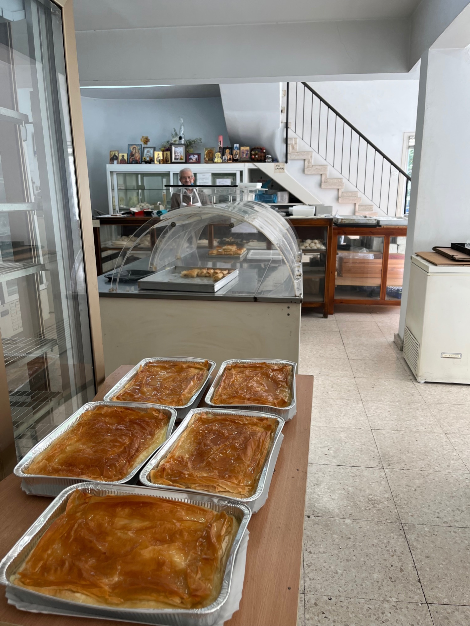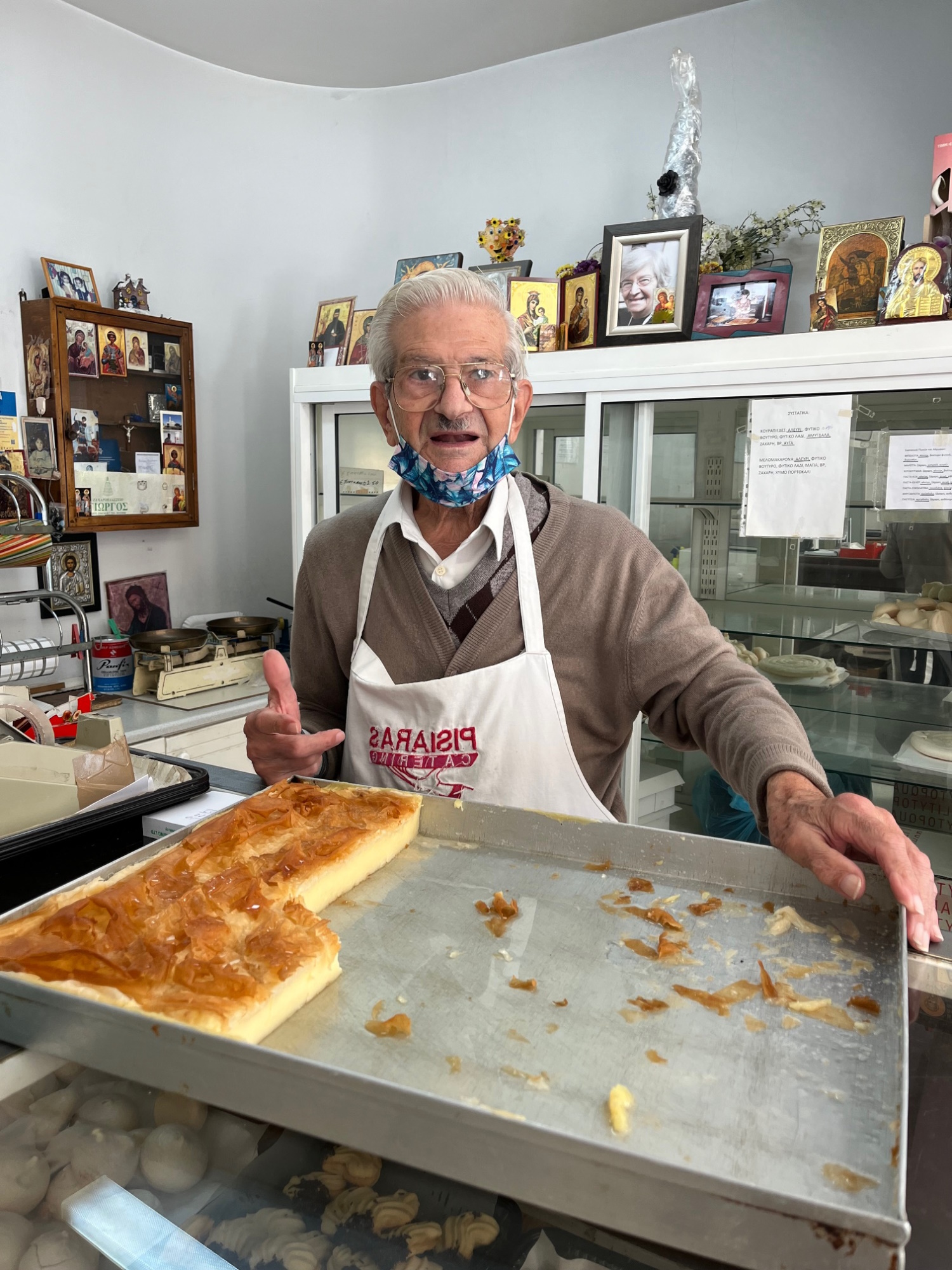 «Έχει μειωθεί η γκάμα προϊόντων με τα χρόνια, δεν προσφέρονται όσα βλέπεις στον τιμοκατάλογο», μου λέει. Παρόλα αυτά η ευγένεια αυτού του ανθρώπου και η αγάπη για αυτό που κάνει, είναι τα στοιχεία που σίγουρα τον βοήθησαν να αντέξει στον χρόνο. Ζητώντας του να μου πει το μυστικό για το τέλειο γαλακτομπούρεκο, χαμογελά, απαντώντας μου ότι δεν μπορεί να μου αποκαλύψει τη συνταγή. «Πρέπει να είσαι μερακλής για να το κάμεις. Ένα πράμα που κάμνεις, πρέπει να είσαι μερακλής, να έσιεις αγάπη. Αν μεν το αγαπάς μεν το κάμεις». Χαμογελώ κι εγώ με την απάντησή του και του λέω ότι αυτό ακριβώς περίμενα να μου πει. Και τότε σχηματίζεται αβίαστα άλλο ένα χαμόγελο στο πρόσωπό του.