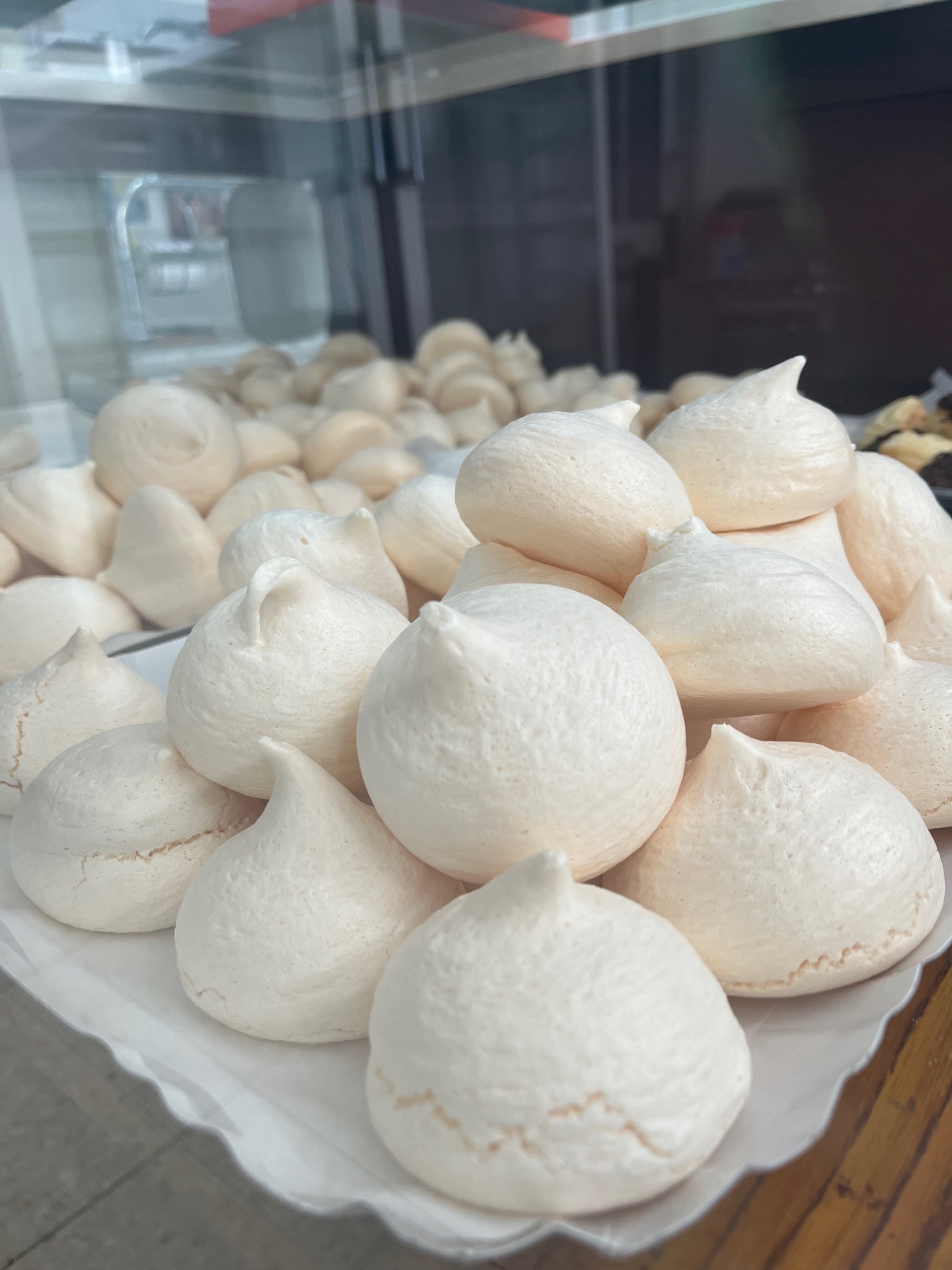 Στις μέρες μας, σίγουρα η γκάμα προϊόντων του ζαχαροπλαστείου δεν είναι μεγάλη, σε σχέση με το παρελθόν. Στις βιτρίνες βλέπω μόνο μερικά συροπιαστά, ορισμένα αλμυρά σνακ, μπισκότα, κάποια πτι φουρ (παστούδες), αλλά και μαρέγγες, που όπως μου είπε πολλοί τις αγοράζουν για να φτιάχνουν γλυκά στο σπίτι.