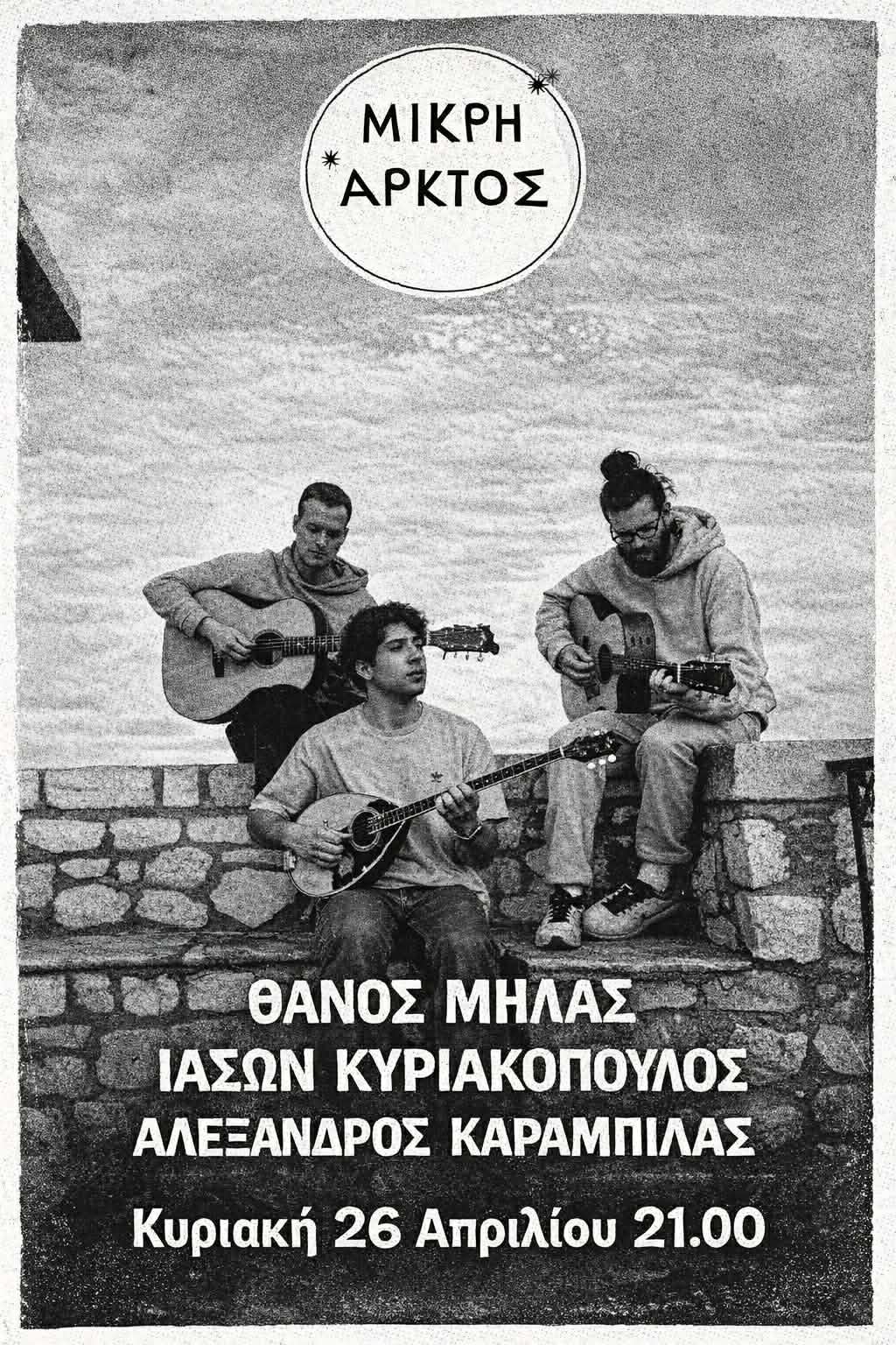 Μαζί με με τον Ιάσωνα Κυριακόπουλο που παίζει κιθάρα (και επίσης γράφει ωραία τραγούδια) και τον Αλέξανδρο Καραμπίλα που παίζει ηλεκτρική κιθάρα θα παρουσιάσουν επιλογή από έντεχνα και διασκευασμένα λαϊκά στην Μικρή Άρκτο.