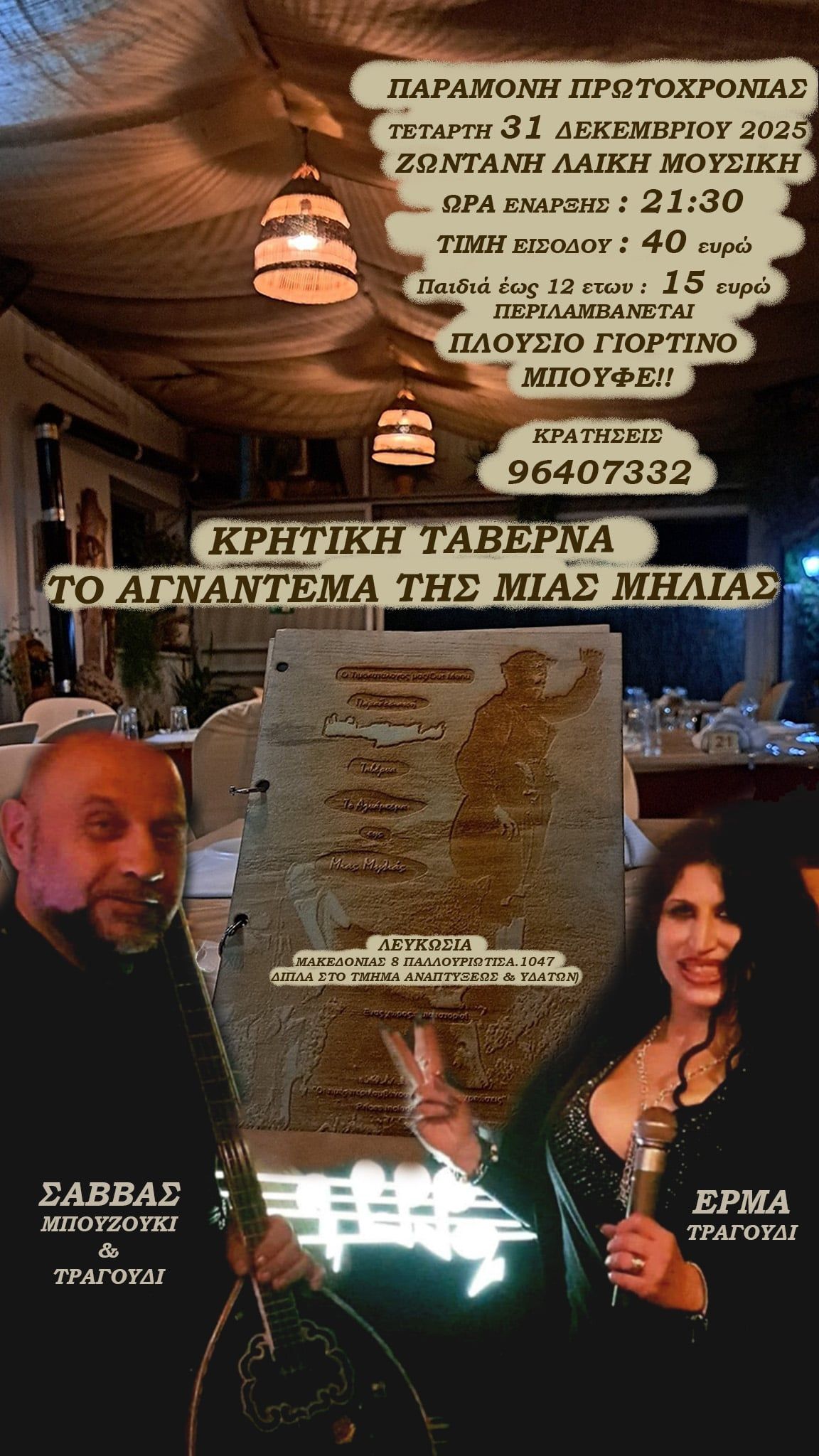 Η δημοφιλής κρητική ταβέρνα της Αγλαντζιάς μας καλεί να υποδεχτούμε τον νέο χρόνο με απολαυστικό γιορτινό μπουφέ και να διασκεδάσουμε με το γεμάτο ενέργεια πρόγραμμα των Έρμα (τραγούδι) και Σάββα (τραγούδι και μπουζούκι). Κρατήσεις 96407332