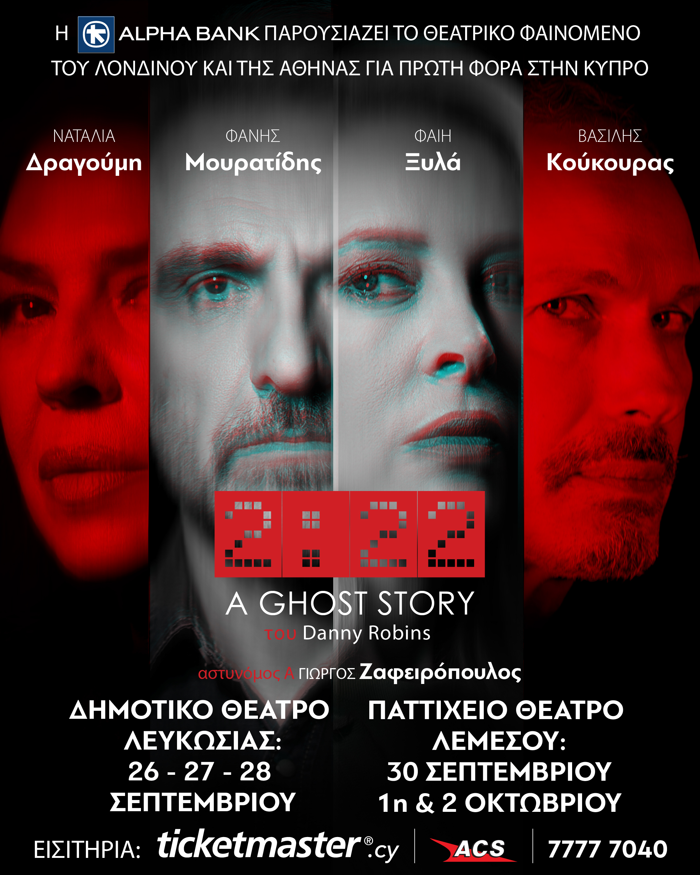 Η ALPHA BANK το παρουσιάζει για πρώτη φορά στην Κύπρο. Πρόκειται για ένα σύγχρονο υπερφυσικό θρίλερ που έχει αποσπάσει διθυραμβικές κριτικές στο West End του Λονδίνου, υποψηφιότητες για 3 βραβεία Laurence Olivier, καθώς και το βραβείο «Καλύτερου Νέου Έργου» στα Βραβεία WhatsOnStage, το 2022.