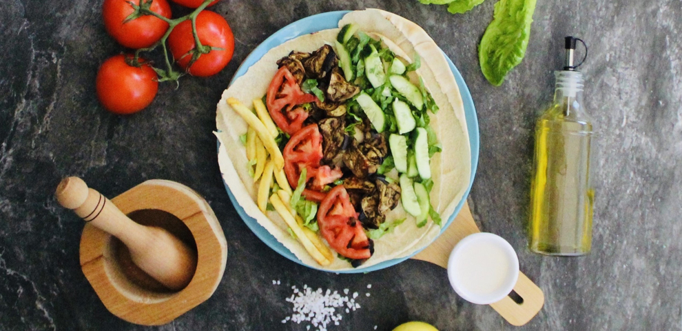Σάντουιτς με ψητή μελιτζάνα: Η νέα γεύση στο vegan menu. Σάντουιτς με ψητή μελιτζάνας σε πίτα! Απολαύστε τη φρεσκοψημένη στον φούρνο μελιτζάνα μας, τυλιγμένη σε λιβανέζικη πίτα με μαρούλι, ντομάτα, αγγούρι, πατάτες και ταχίνι! Η μελιτζάνα είναι μια καταπληκτική επιλογή για γεύμα, καθώς είναι εξαιρετικά θρεπτική, και ένα γευστικό υποκατάστατο κρέατος, ιδανικό για μια χορτοφαγική διατροφή!
