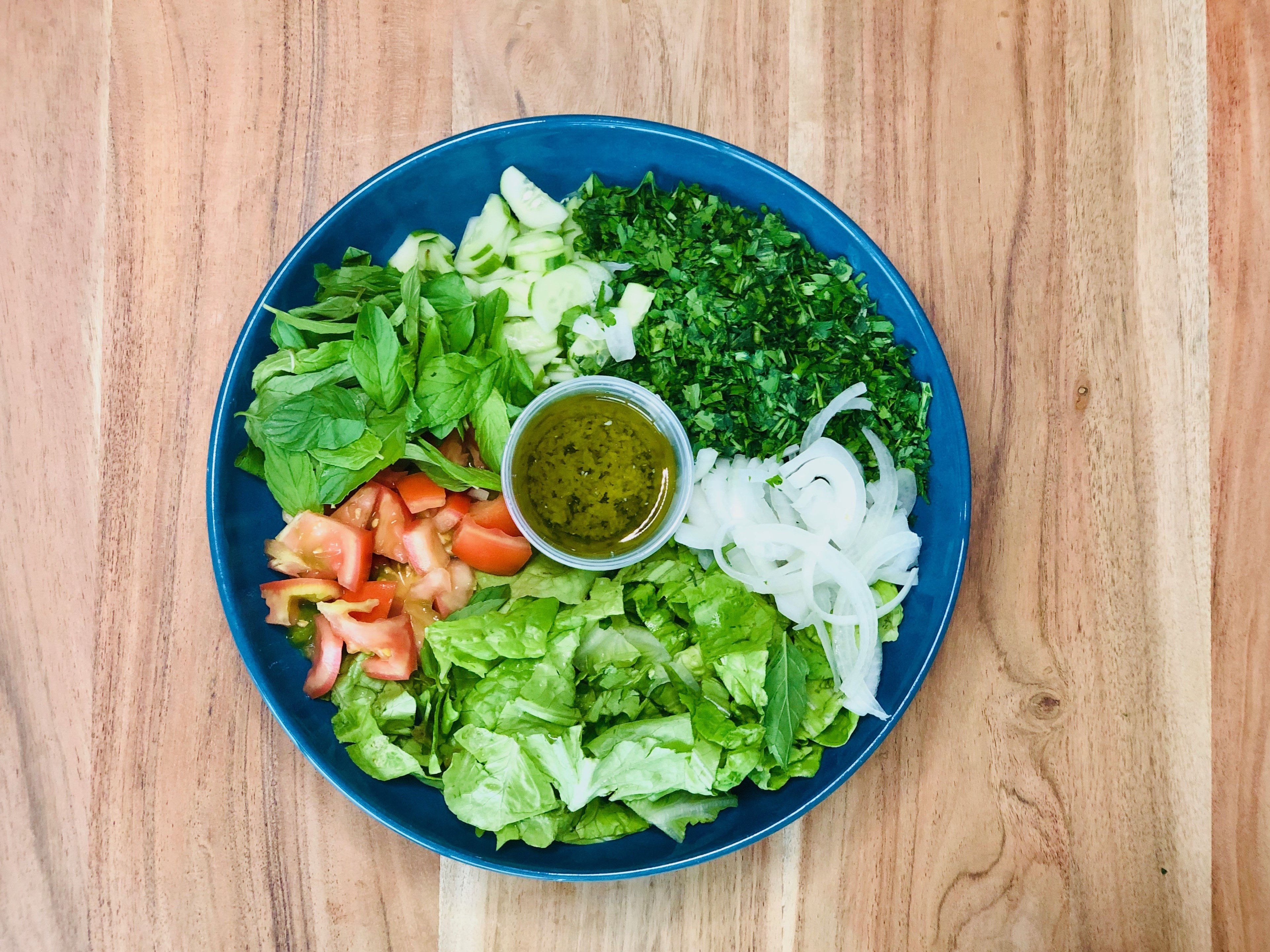 Λιβανέζικη σαλάτα: Η λιβανέζικη σαλάτα τους περιλαμβάνει μαρούλι, μαϊντανό, ντομάτα, κρεμμύδι, αγγουράκι, μέντα. Σερβίρεται με σος από λεμόνι & σκόρδο. Υπάρχει επιλογή για προσθήκη φαλάφελ ή λαχανικών ψημένων στο φούρνο (μελιτζάνα και κουνουπίδι).