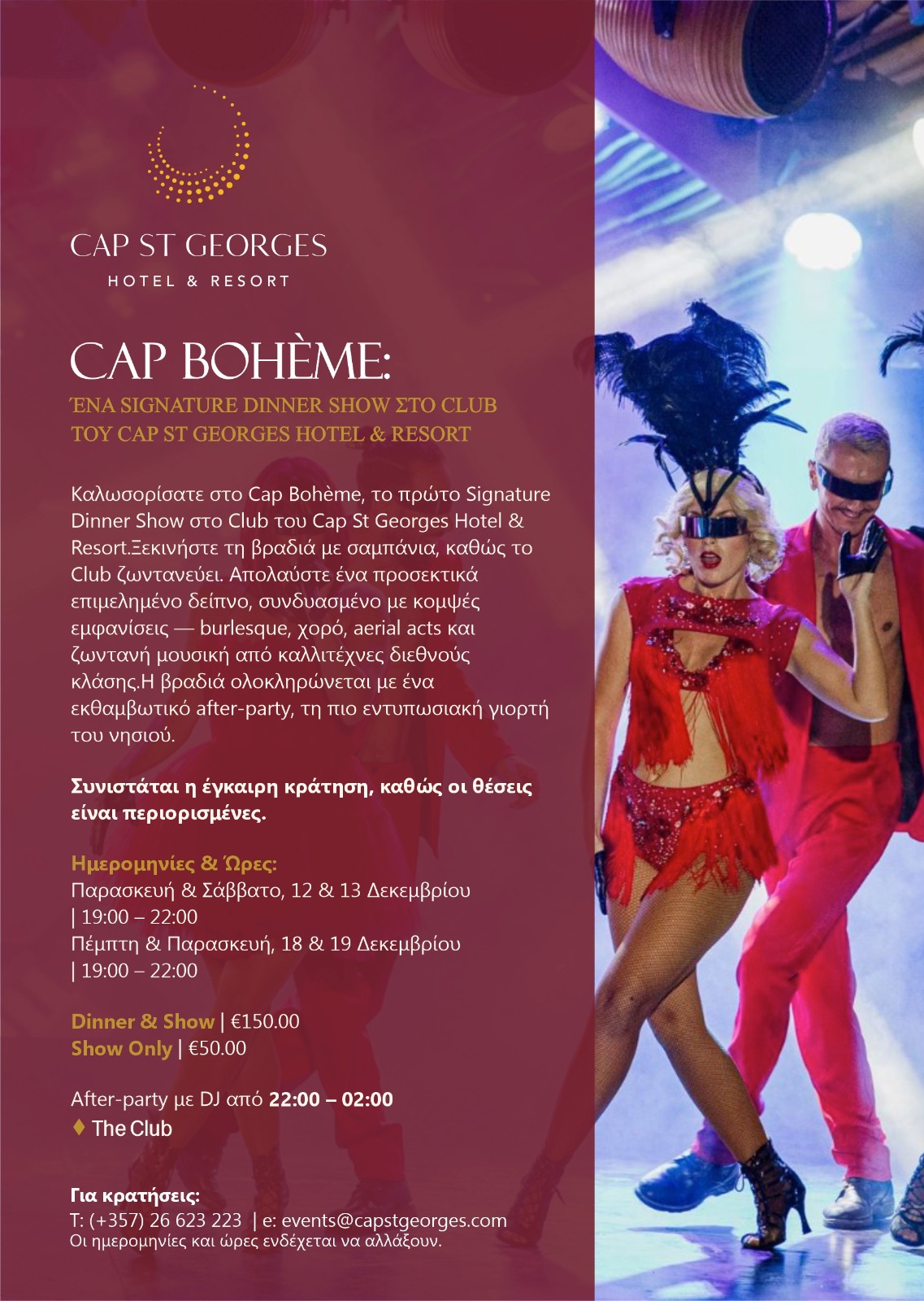 Ξεκινήστε τη βραδιά με σαμπάνια, καθώς το Club ζωντανεύει. Απολαύστε ένα προσεκτικά επιμελημένο δείπνο, συνδυασμένο με κομψές εμφανίσεις -burlesque, χορό, aerial acts και ζωντανή μουσική από καλλιτέχνες διεθνoύς κλάσης.