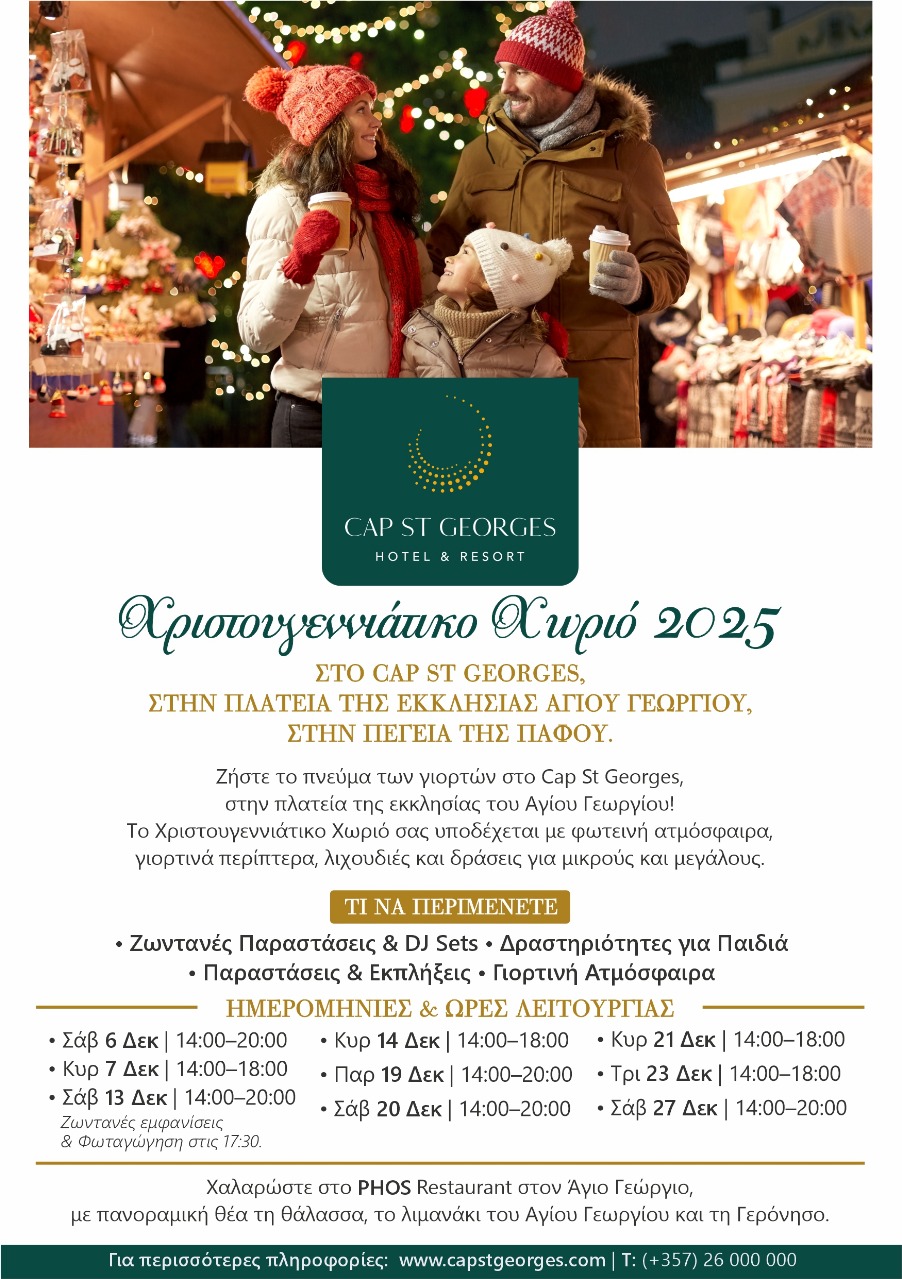 Ανακαλύψτε ΕΔΩ όλο το χριστουγεννιάτικο πρόγραμμα Winter Fest 2025 του Cap St Georges Hotel & Resort και κλείστε τώρα τη διαμονή σας για τα πιο μαγευτικά χριστούγεννα!