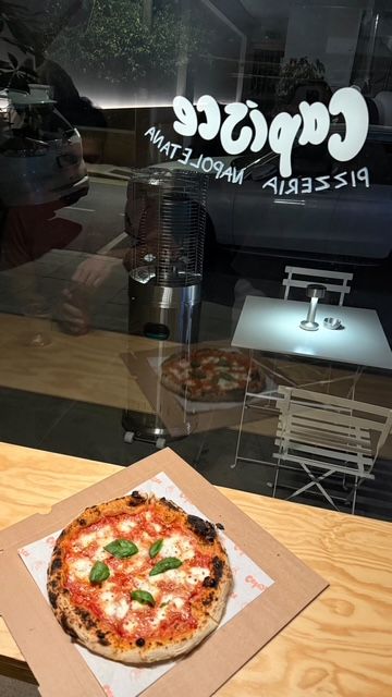 Στο μενού της πιτσαρίας Capisce ξεχωρίζουν επιλογές όπως η burrata με πέστο βασιλικού που φτιάχνεται in-house, η αρωματική funghi με τυριά, μανιτάρια porcini και chives, καθώς και η jamón ibérico με hot honey.
