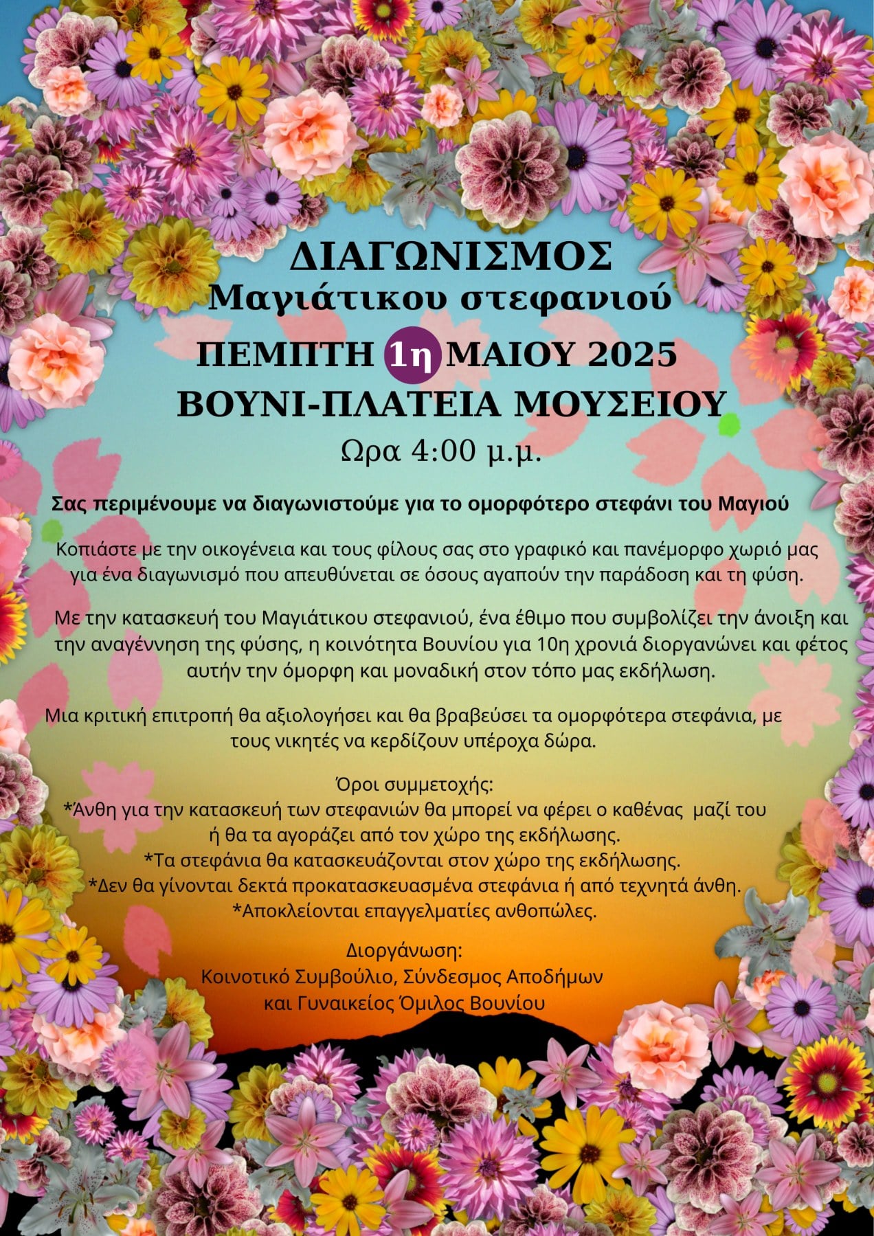Την Πέμπτη 1η Μαΐου 2025, στις 16:00, θα πραγματοποιηθεί και πάλι ο διαγωνισμός μαγιάτικου στεφανιού στην πλατεία του Μουσείου, στο Βουνί. Η εκδήλωση, που διοργανώνεται για δέκατη συνεχή χρονιά, έχει στόχο να τιμήσει την παράδοση της Πρωτομαγιάς, συμβολίζοντας την άνοιξη και την αναγέννηση της φύσης.