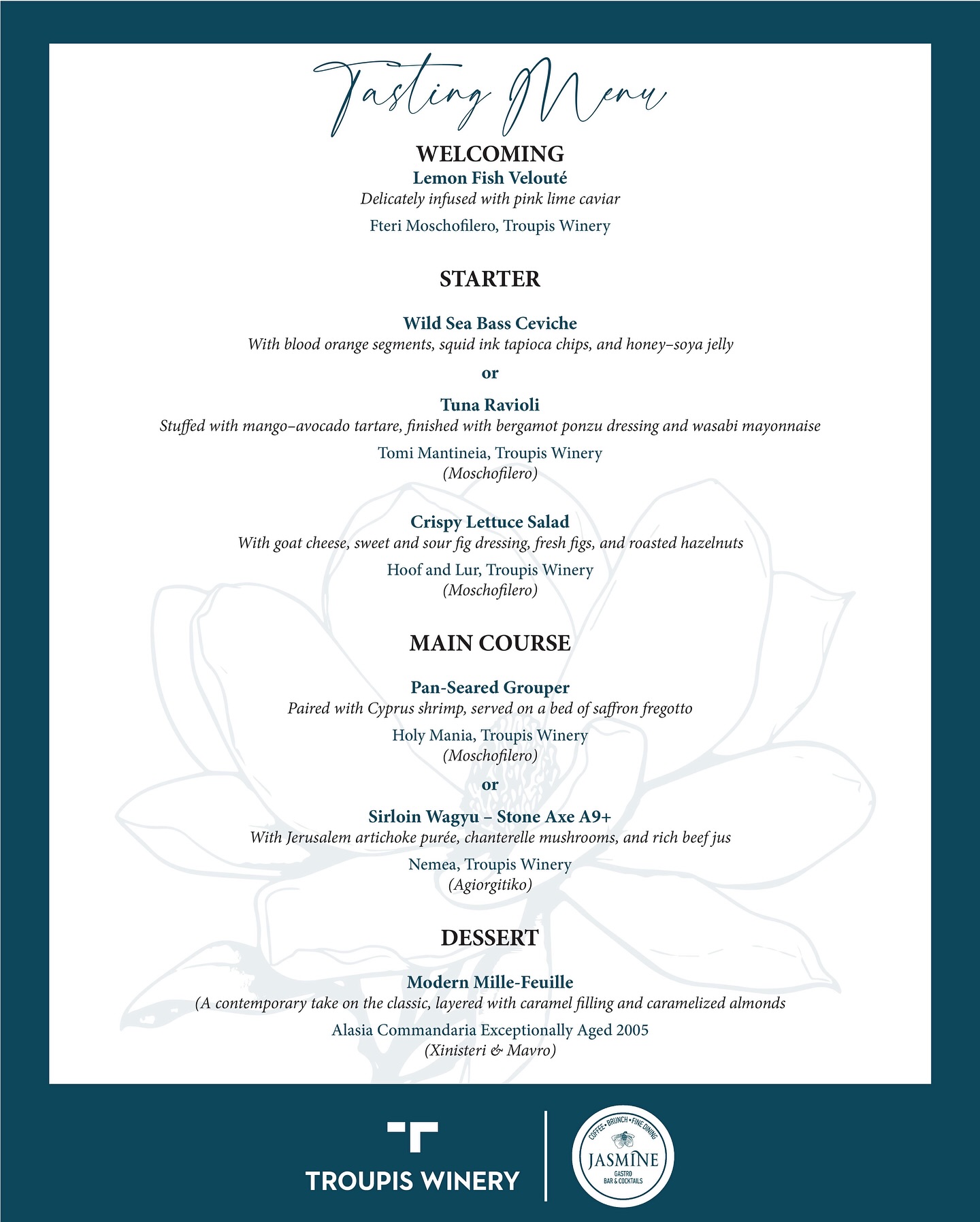 Σε συνεργασία με το ελληνικό οινοποιείο Τρουπή, το οποίο βρίσκεται στo κέντρο του οροπεδίου της Μαντινείας, στην περιοχή Φτέρη, σε υψόμετρο περίπου 700 μ, το Jasmine Gastrobar παρουσιάζει την Πέμπτη 20 Νοεμβρίου ένα dinner με ορισμένα special πιάτα ειδικά για τη βραδιά, τα οποία συνδυάζονται με έξι κρασιά του οινοποιείου (wine pairing από τον Γιώργο Κτίστη, wine consultant στη Laiko-Cosmos).