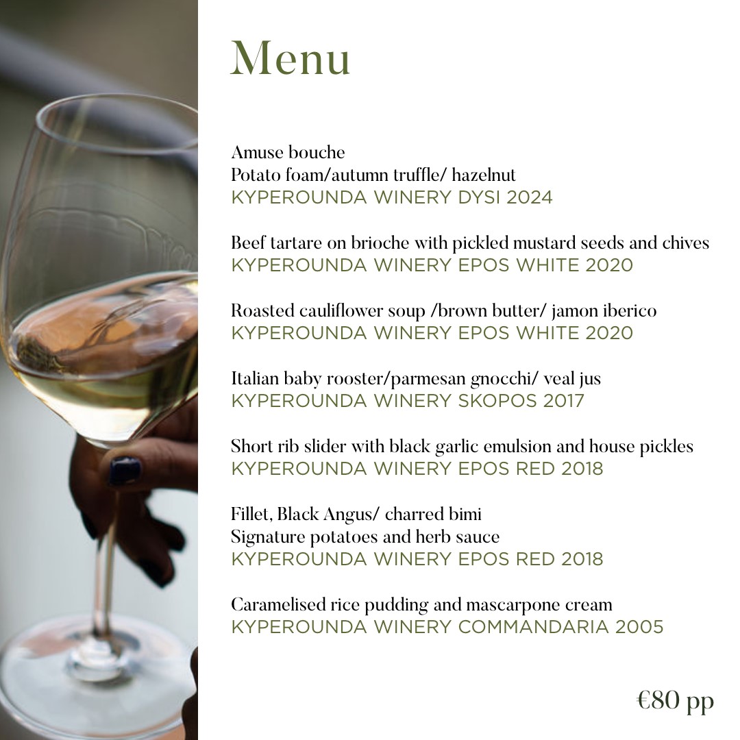 Κατά τη διάρκεια της εκδήλωσης, οι συμμετέχοντες θα απολαύσουν ένα ειδικά επιλεγμένο μενού, σχεδιασμένο για να αναδείξει τις ιδιαίτερες γεύσεις των κρασιών του οινοποιείου Κυπερούντας. Κάθε πιάτο θα συνοδεύεται από vintage κρασιά του οινοποιείου, προσφέροντας μια πλήρη γαστρονομική εμπειρία που συνδυάζει αρμονικά γεύσεις και αρώματα.