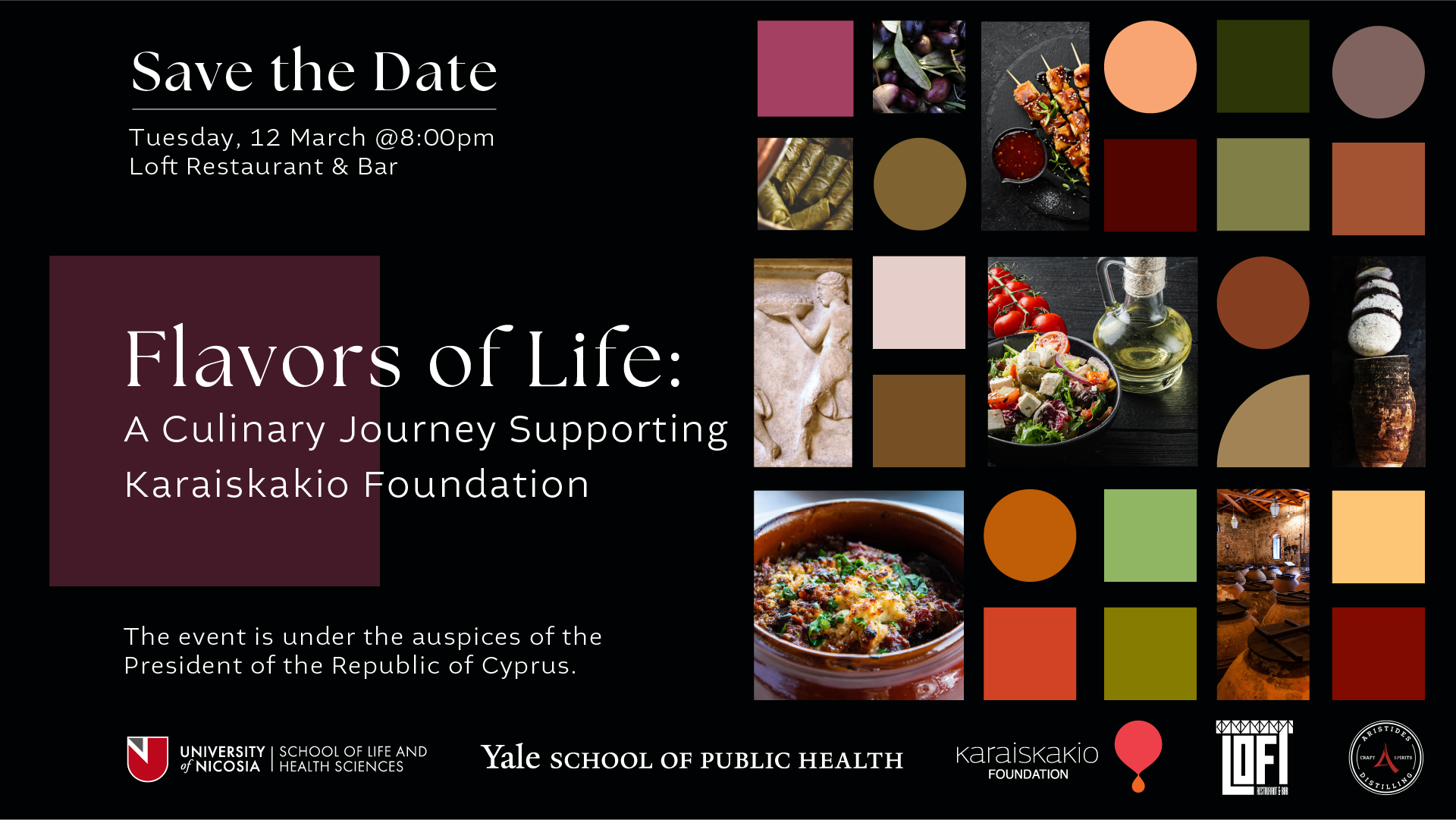 Σημειώστε τα ημερολόγιά σας για μια αξέχαστη γαστρονομική εκδήλωση που διοργανώνει η Σχολή Επιστημών Ζωής και Υγείας του Πανεπιστημίου Λευκωσίας, σε συνεργασία με τη Σχολή Δημόσιας Υγείας του Πανεπιστημίου Yale, την Τρίτη 12 Μαρτίου στο LOFT Restaurant (στον 12o όροφο της εστίας SIX).