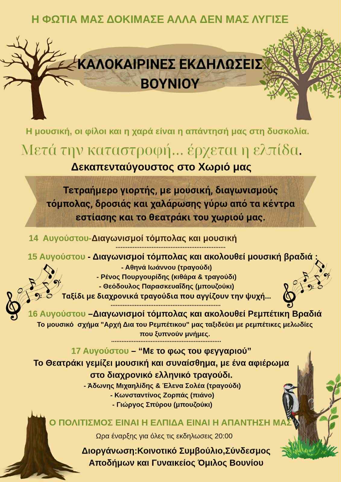 Η μουσική, οι φίλοι και η χαρά είναι η απάντησή μας στη δυσκολία, αναφέρεται στο flyer με το πλήρες πρόγραμμα για το τετραήμερο εκδηλώσεων, το οποίο διοργανώνουν από κοινού το Κοινοτικού Συμβούλιο, ο Σύνδεσμος Αποδήμων και ο Γυναικείος Όμιλος Βουνίου.