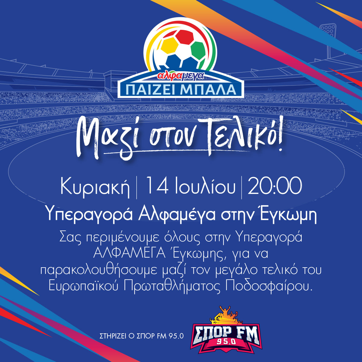 Σας προσκαλούμε στον χώρο στάθμευσης της Υπεραγοράς ΑΛΦΑΜΕΓΑ στην Έγκωμη, να παρακολουθήσουμε όλοι μαζί τον μεγάλο τελικό του Ευρωπαϊκού Πρωταθλήματος Ποδοσφαίρου.