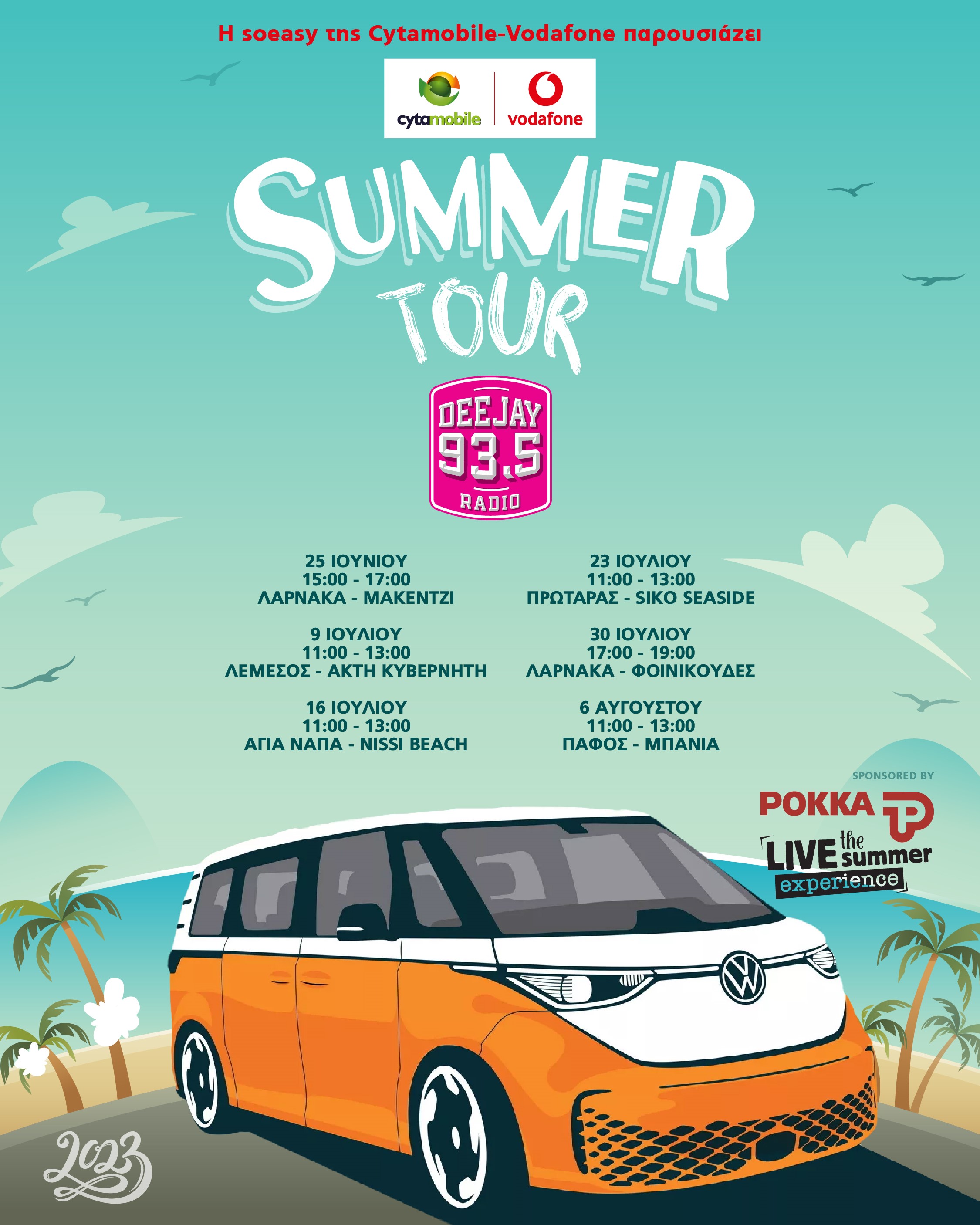 Το Summer Tour θα ταξιδέψει σε όλες τις παράλιες πόλεις του νησιού! Ξεκινάει στις 25 Ιουνίου με πρώτο σταθμό τη Λάρνακα (Μακένζι), συνεχίζει με Λεμεσό, Αγία Νάπα, Πρωταρά, Λάρνακα (Φοινικούδες) και κλείνει με Πάφο!