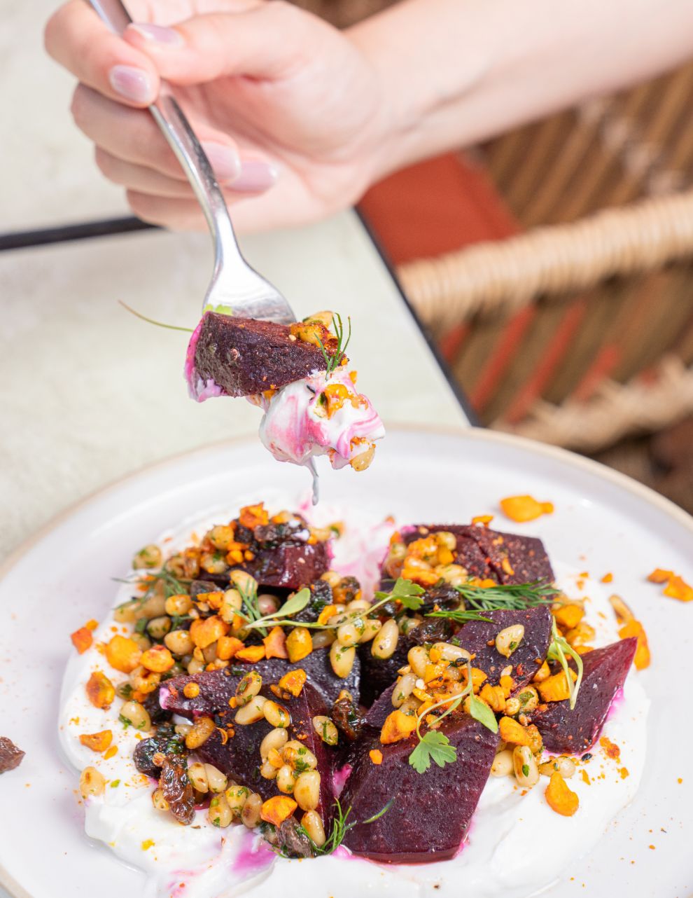 -Beetroot Labneh: Μια χρωματιστή πανδαισία από στραγγιστό κατσικίσιο γιαούρτι, ψητά παντζάρια, ρελός σταφίδας και το αρωματικό μείγμα μπαχαρικών dukkah. Φρέσκο, ελαφρύ και ανατρεπτικά απολαυστικό.