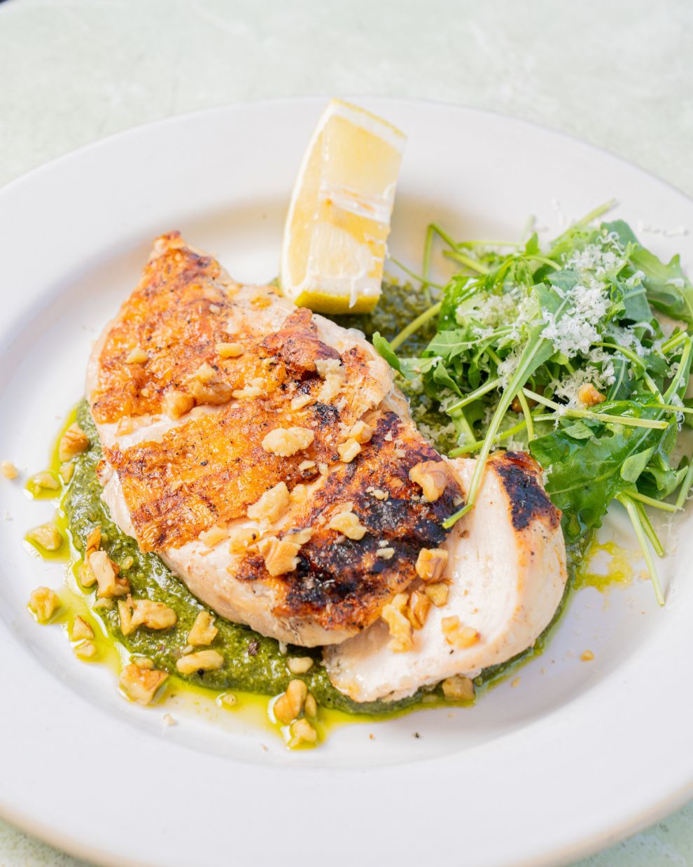 -Chicken Al Mattone: Ζουμερό φιλέτο κοτόπουλου στη σχάρα, με πέστο από καρύδια και σπανάκι, ρόκα και λεμόνι – για όσους αναζητούν ένα πιο χορταστικό αλλά πάντα καλοκαιρινό πιάτο.