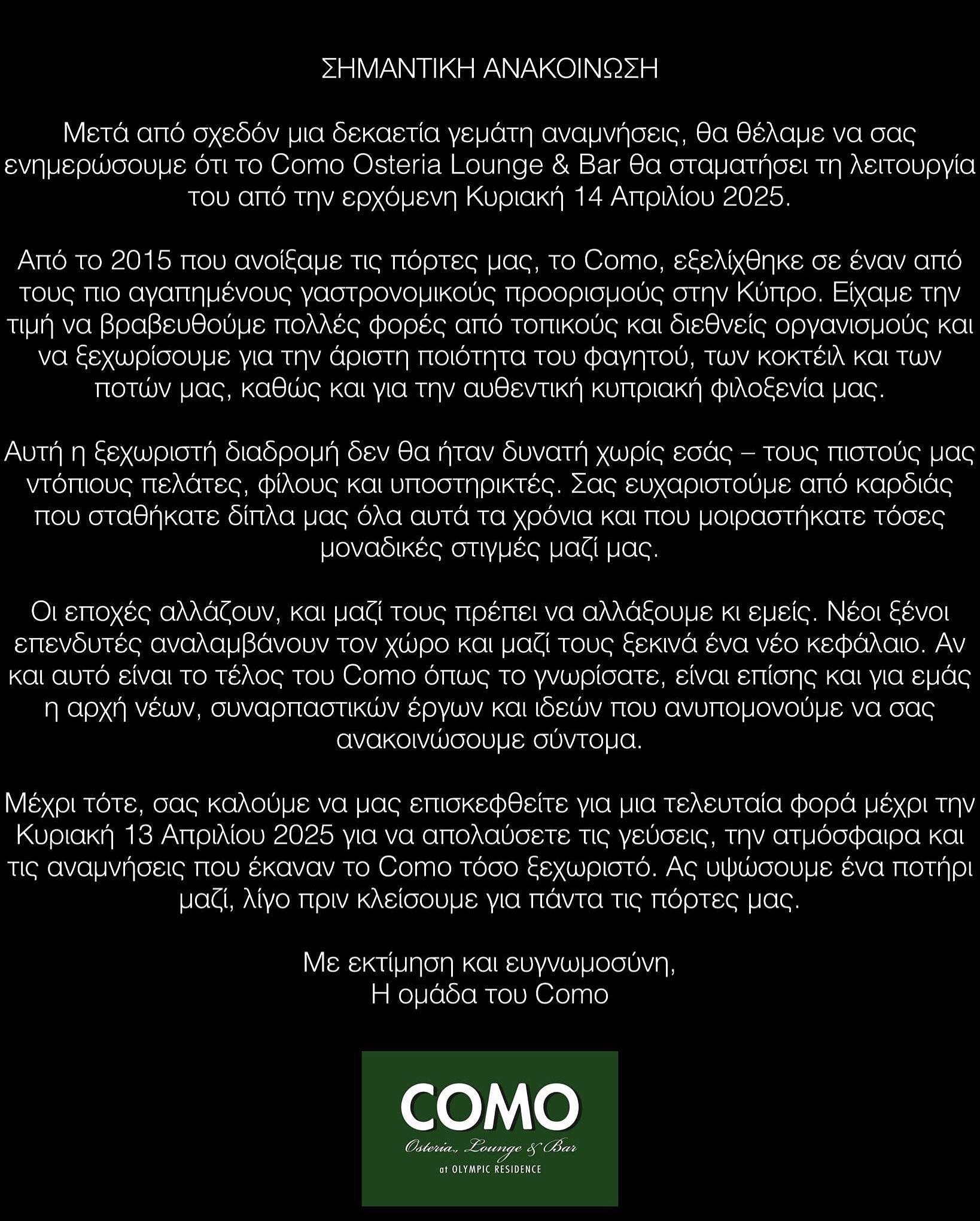 «Οι εποχές αλλάζουν και μαζί τους πρέπει να αλλάξουμε κι εμείς. Νέοι, ξένοι επενδυτές αναλαμβάνουν τον χώρο και μαζί τους ξεκινά ένα νέο κεφάλαιο. Αν και αυτό είναι το τέλος του Como όπως το γνωρίσατε, είναι επίσης και για εμάς η αρχή νέων, συναρπαστικών έργων και ιδεών, που ανυπομονούμε να σας ανακοινώσουμε σύντομα.