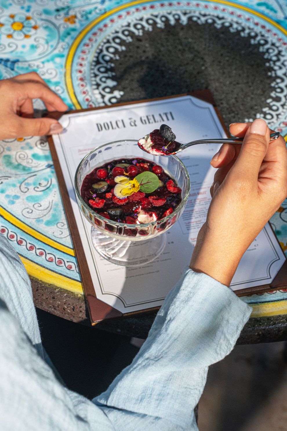Παρότι η διάθεση διαφέρει, το μενού ενώνει τους δύο αυτούς χώρους, δημιουργώντας μια ζωντανή γιορτή ιταλικών-μεσογειακών γεύσεων. Από χειροποίητα ζυμαρικά και φρέσκα θαλασσινά έως λιαστά λαχανικά και άλλες τοπικές λιχουδιές, κάθε πιάτο αντικατοπτρίζει πάθος, λεπτότητα και δυνατή γεύση. Και φυσικά, τα ακαταμάχητα Dolci & Gelati.
