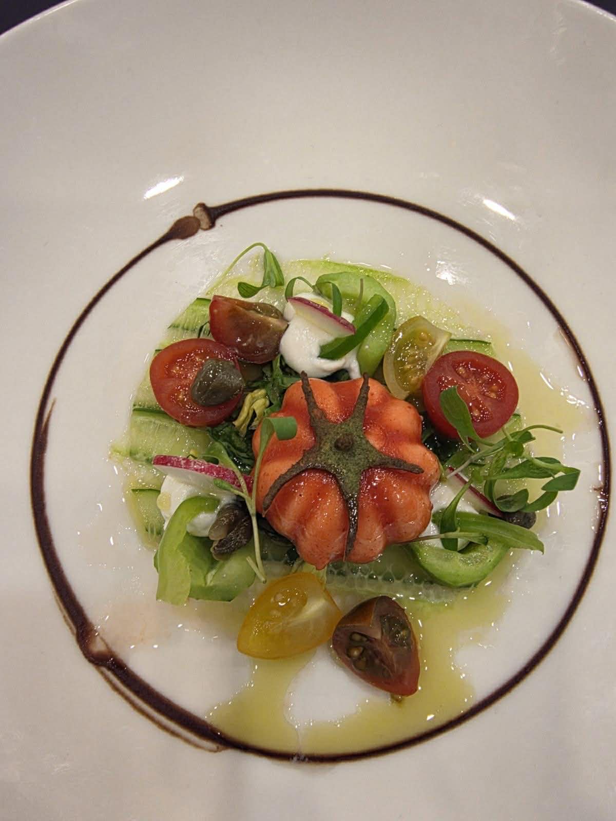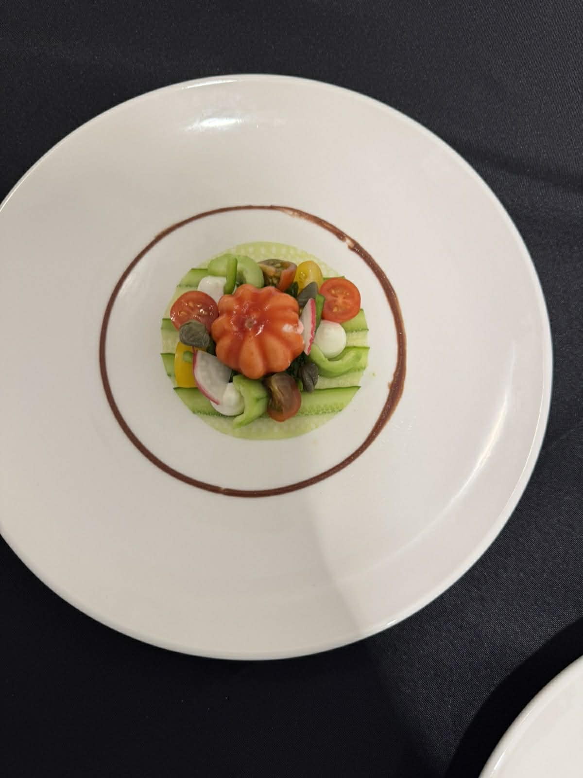 Όλα τα πιάτα φαίνονται εντυπωσιακά στις εικόνες που εξασφαλίσαμε, αλλά η αποδομημένη χωριάτικη σαλάτα σίγουρα ξεχωρίζει. Αρκεί να αναφέρουμε πως αυτό που μοιάζει με ντομάτα στο κέντρο έχει φτιαχτεί με μους από κυπριακά τυριά που στη συνέχεια τοποθετήθηκαν σε τζελ σε σχήμα ντομάτας, ενώ αυτό που μοιάζει με κοτσάνι είναι τουίλ.