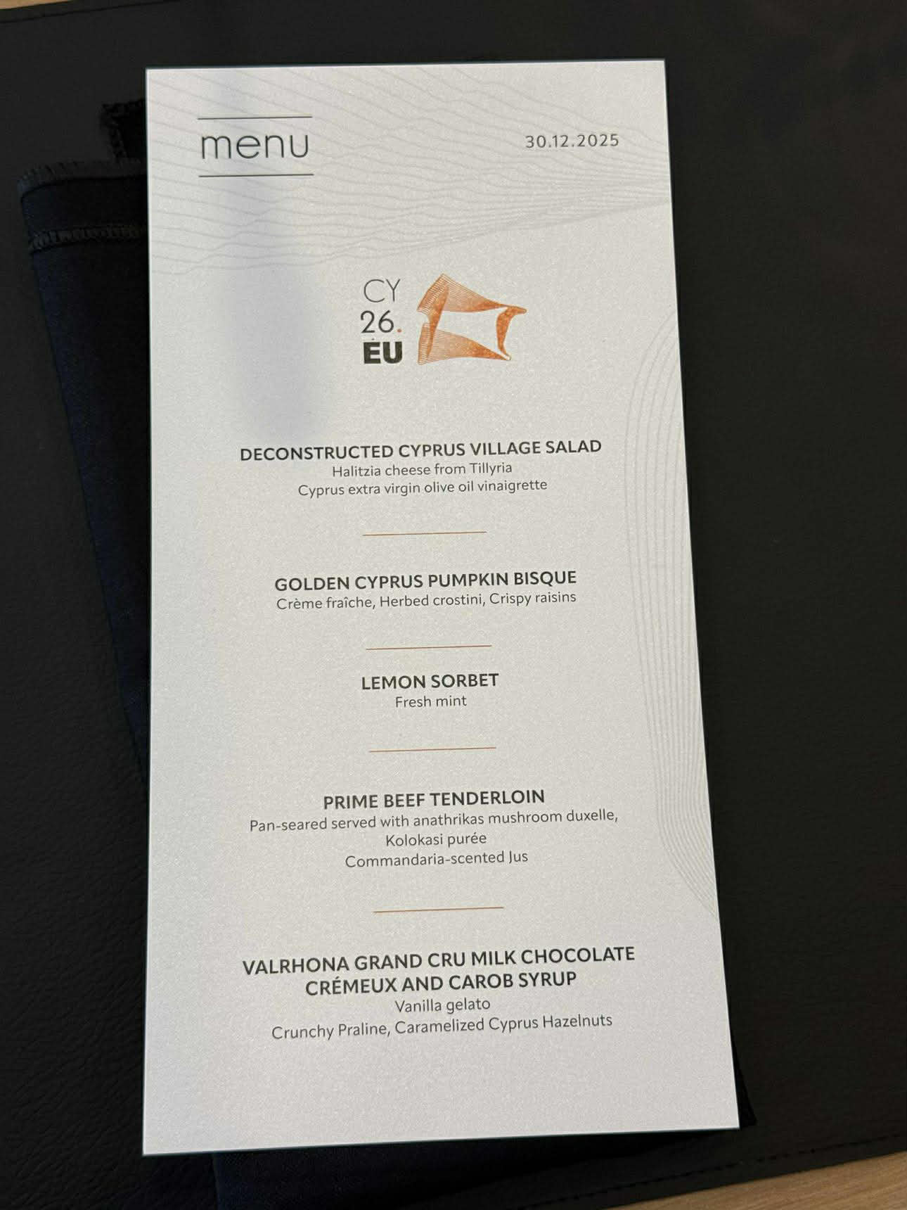 Έχουν αποπερατωθεί σήμερα Τρίτη 30 Δεκεμβρίου οι προσομοιώσεις για να φανεί ο βαθμός ετοιμότητάς μας για την επικείμενη Προεδρία. Στα χέρια μας έφτασε ένα από τα μενού που δοκιμάστηκαν σήμερα, ανοίγοντάς μας για τα καλά την όρεξη για το τι θα ακολουθήσει. Συγκεκριμένα, σήμερα δοκιμάστηκε ένα από τα έξι Υπουργικά Μενού, το οποίο περιελάβανε μια αποδομημένη κυπριακή χωριάτικη σαλάτα, μια σούπα κολοκύθας (που απ’ ότι μάθαμε έδινε την αίσθηση της κολοκοτής σε υγρή μορφή), ένα lemon sorbet, ένα prime beef tenderloin, αλλά και ένα επιδόρπιο με Valrhona Grand Cru Milk Chocolate.