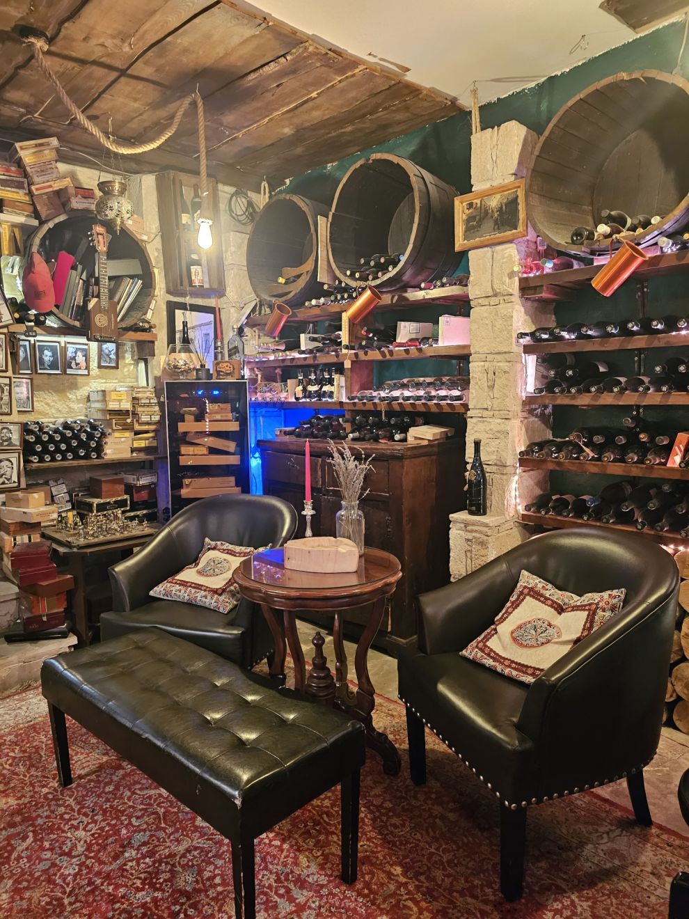 Ξεχωριστή πινελιά αποτέλεσε το εντυπωσιακό κελάρι, όπου μπορούσες να επιλέξεις το κρασί της προτίμησής σου μέσα από μια προσεγμένη συλλογή και να χαλαρώσεις σε έναν ιδιαίτερο, ατμοσφαιρικό χώρο.