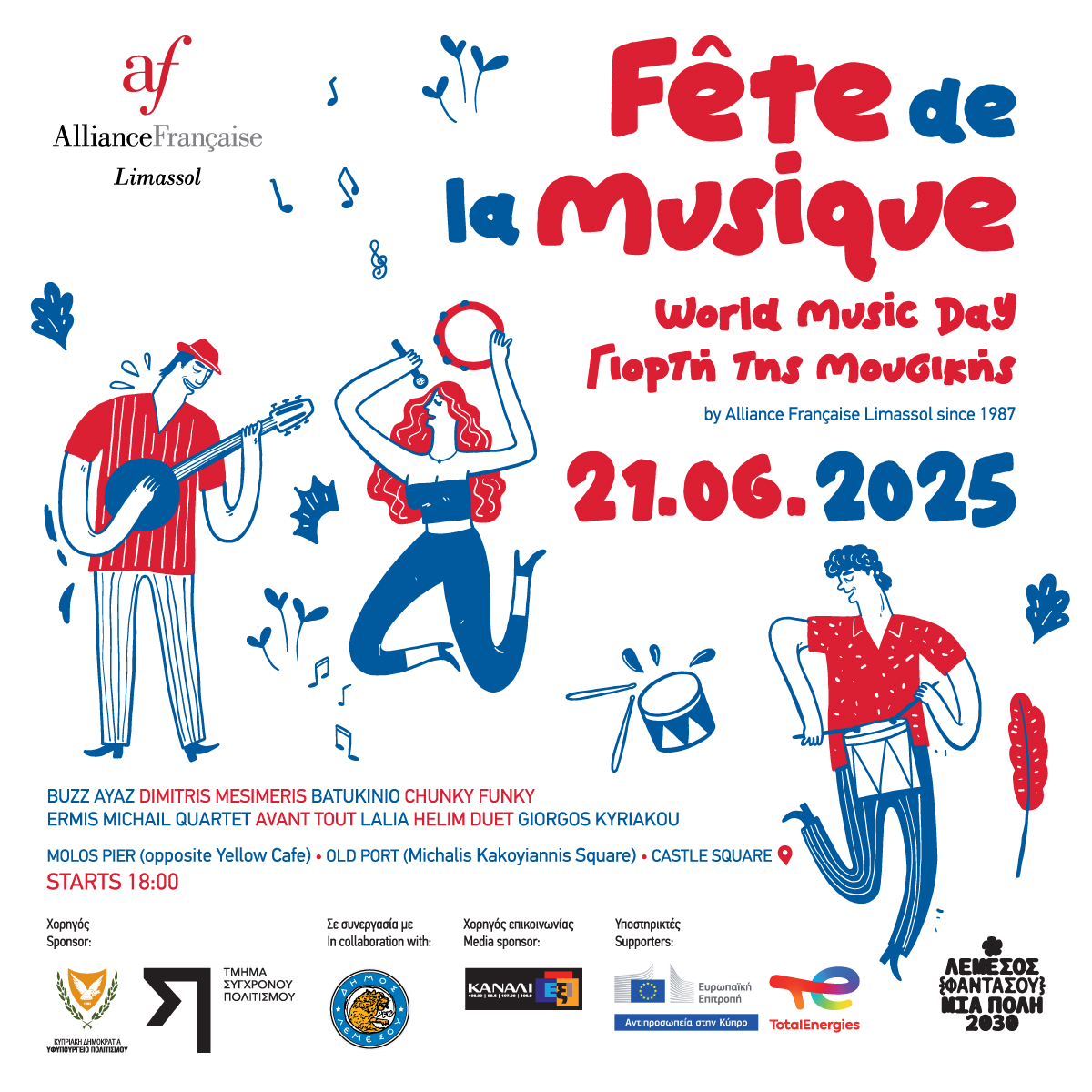Από το 1987, η Alliance Française Λεμεσού γιορτάζει με περηφάνεια τη Γιορτή της Μουσικής, εμπνευσμένη από τη γαλλική πρωτοβουλία που ξεκίνησε το 1982 από τον τότε Υπουργό, Ζακ Λανγκ. Η Παγκόσμια Ημέρα Μουσικής, που πλέον γιορτάζεται σε περισσότερες από 120 χώρες, προσφέρει σε όλους μια ημέρα μουσικής έκφρασης, ενέργειας και πολιτιστικής σύνδεσης. Για φέτος μάς προσκαλούν σε μια μουσική διαδρομή στα πιο εμβληματικά σημεία της πόλης. Από την αποβάθρα του Μόλου μέχρι την πλατεία του Παλιού Λιμανιού και την πλατεία του Κάστρου, τρεις υπαίθριες σκηνές θα φιλοξενήσουν πάνω από 80 καλλιτέχνες και οκτώ μουσικά σχήματα, προσφέροντας ένα πλούσιο μουσικό ταξίδι με ελεύθερη είσοδο.
