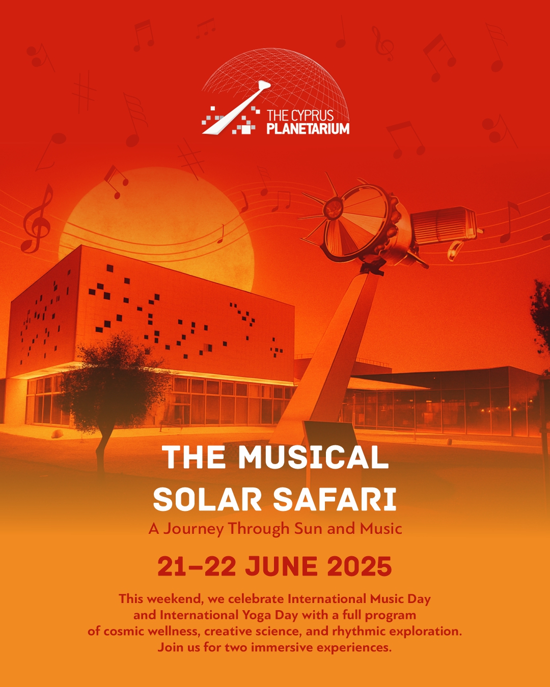 «Γιορτάζουμε την Παγκόσμια Ημέρα Μουσικής και τη Διεθνή Ημέρα Γυναικών στη Μηχανική με ένα αξέχαστο Σαββατοκύριακο στο Κυπριακό Πλανητάριο! Ανακάλυψε έναν μαγικό συνδυασμό επιστήμης, δημιουργικότητας και κοσμικής έμπνευσης, μέσα από δραστηριότητες για όλες τις ηλικίες: Διαδραστικά STEAM εργαστήρια, ηλιακές εκθέσεις & πειράματα, γιόγκα κάτω από τον ουρανό, τέχνη που φωσφορίζει στο σκοτάδι, βραδινή εκδήλωση με κοκτέιλ το Σάββατο. Είτε είσαι μικρός επιστήμονας, λάτρης της μουσικής ή απλά περίεργος για το σύμπαν, το The Musical Solar Safari είναι η ευκαιρία σου να εξερευνήσεις, να δημιουργήσεις και να εμπνευστείς!
