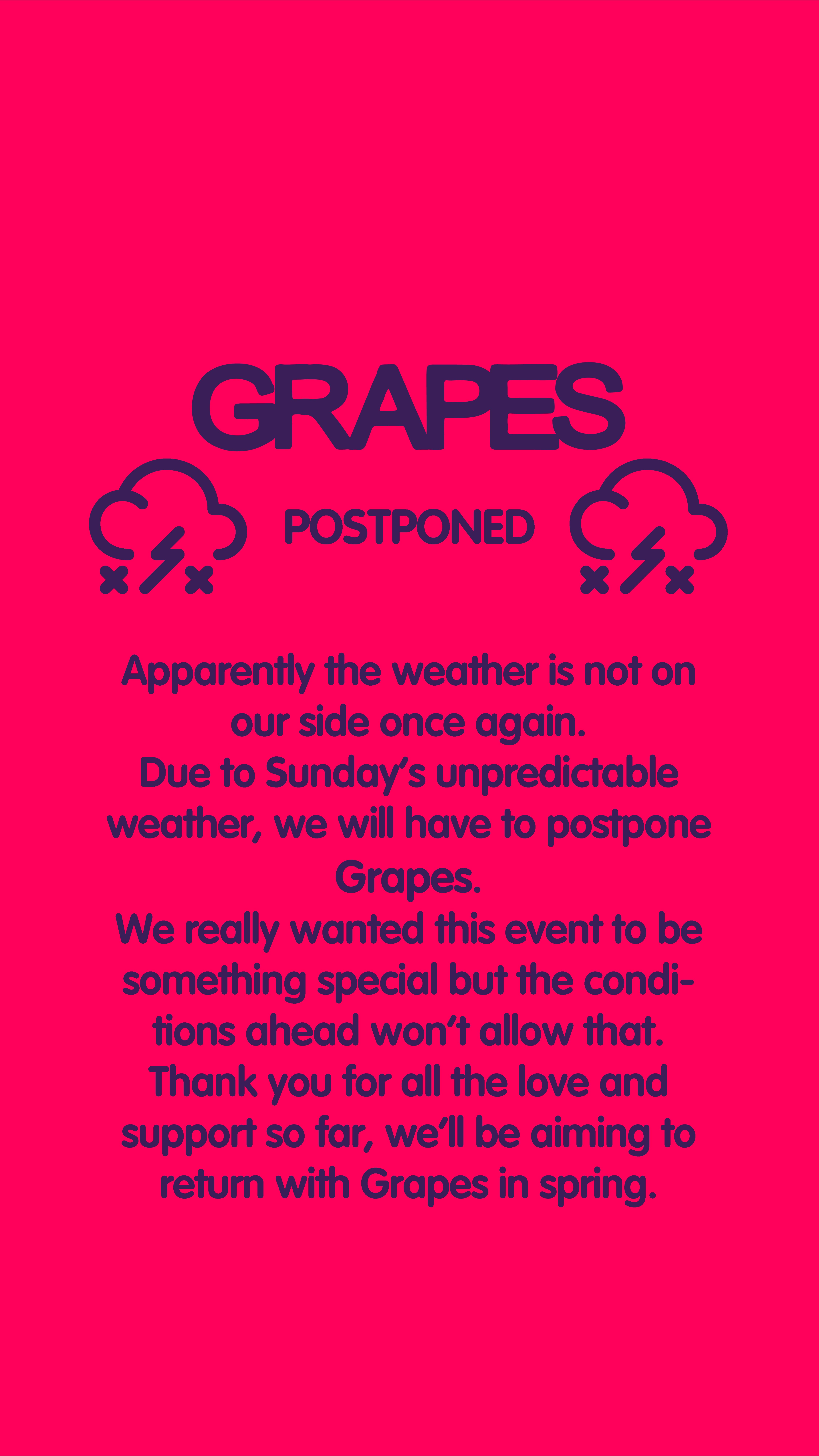 Λόγω της αστάθειας και της απρόβλεπτης εικόνας του καιρού την Κυριακή, το event GRAPES / Sips & Scenes αναβάλλεται.