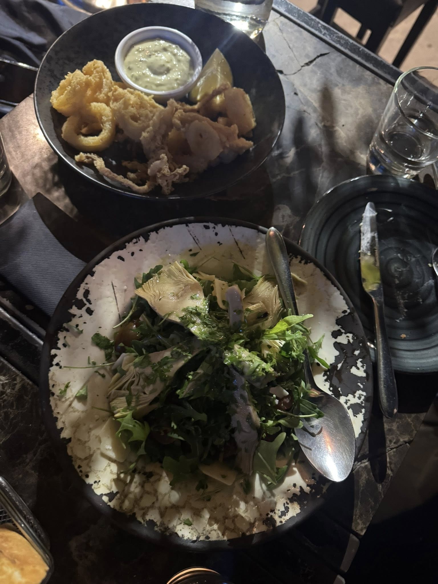 Καθίσαμε σε τραπέζι με θέα τα φώτα του δημαρχείου και δεν άργησαν να έρθουν τα πρώτα πιάτα. Η σαλάτα με αγκινάρες, άγρια ρόκα και νιφάδες παρμεζάνας ήταν δροσερή και ισορροπημένη, με τη βινεγκρέτ λευκής τρούφας να δίνει μια διακριτική αλλά ξεχωριστή ένταση. Οι ρεβυθοκεφτέδες ήρθαν τραγανοί απ’ έξω και αφράτοι μέσα, γεμάτοι αρώματα μεσογειακών μπαχαρικών, και ταίριαζαν ιδανικά με τη βελούδινη σως χούμους.
