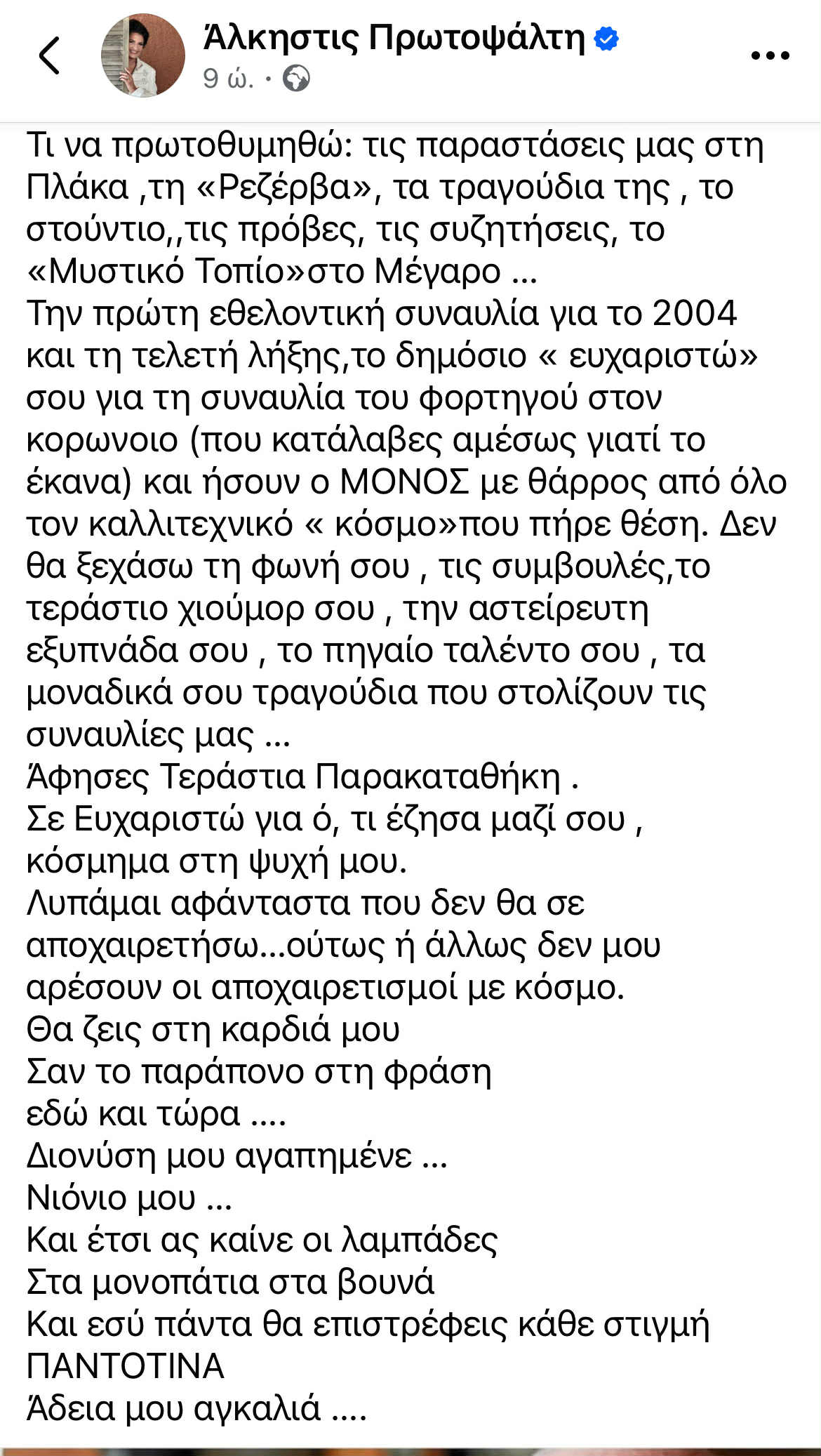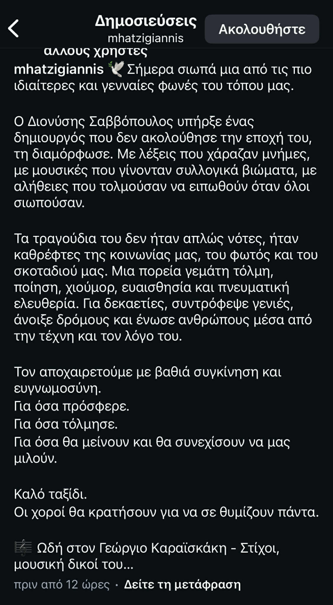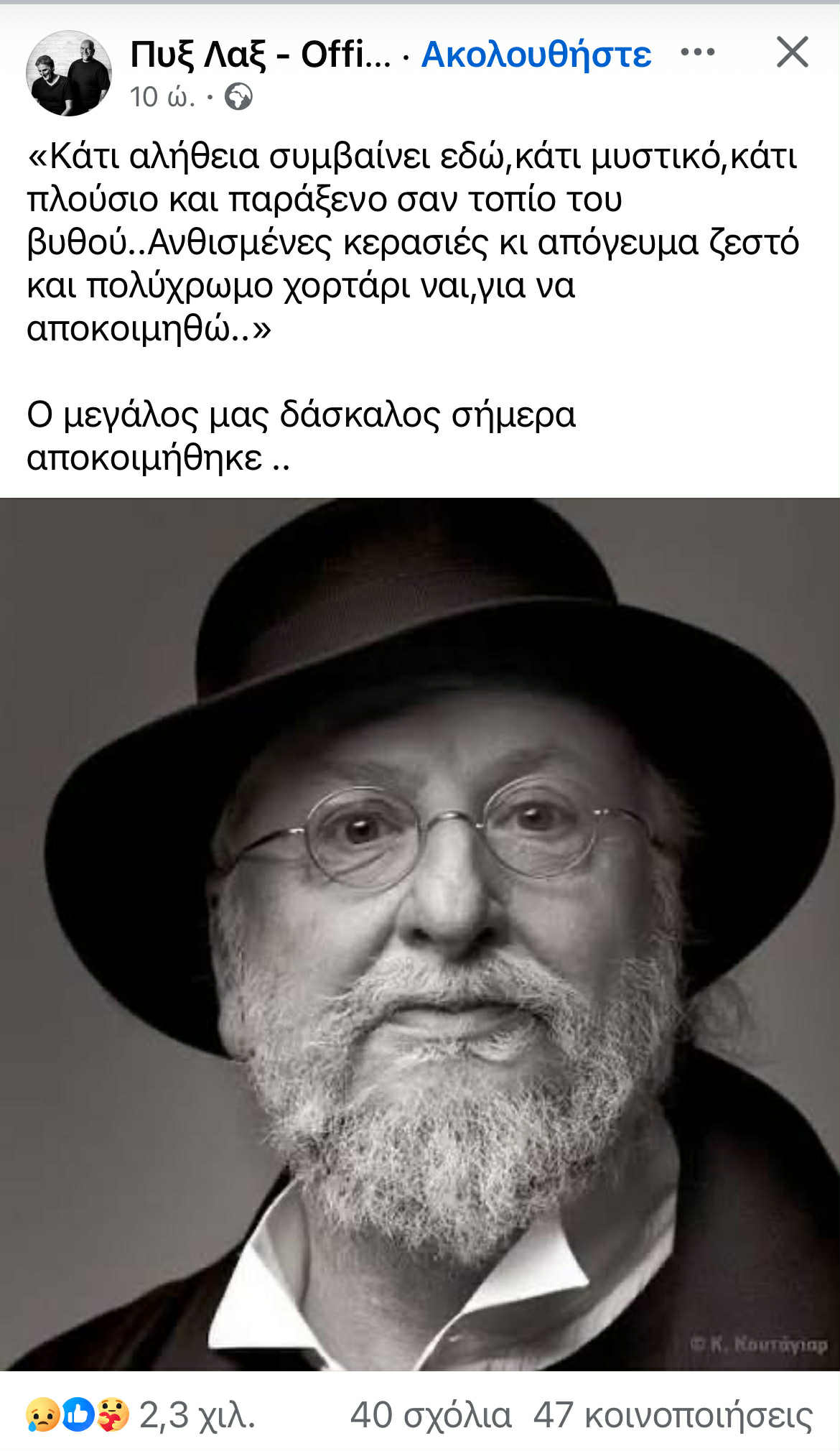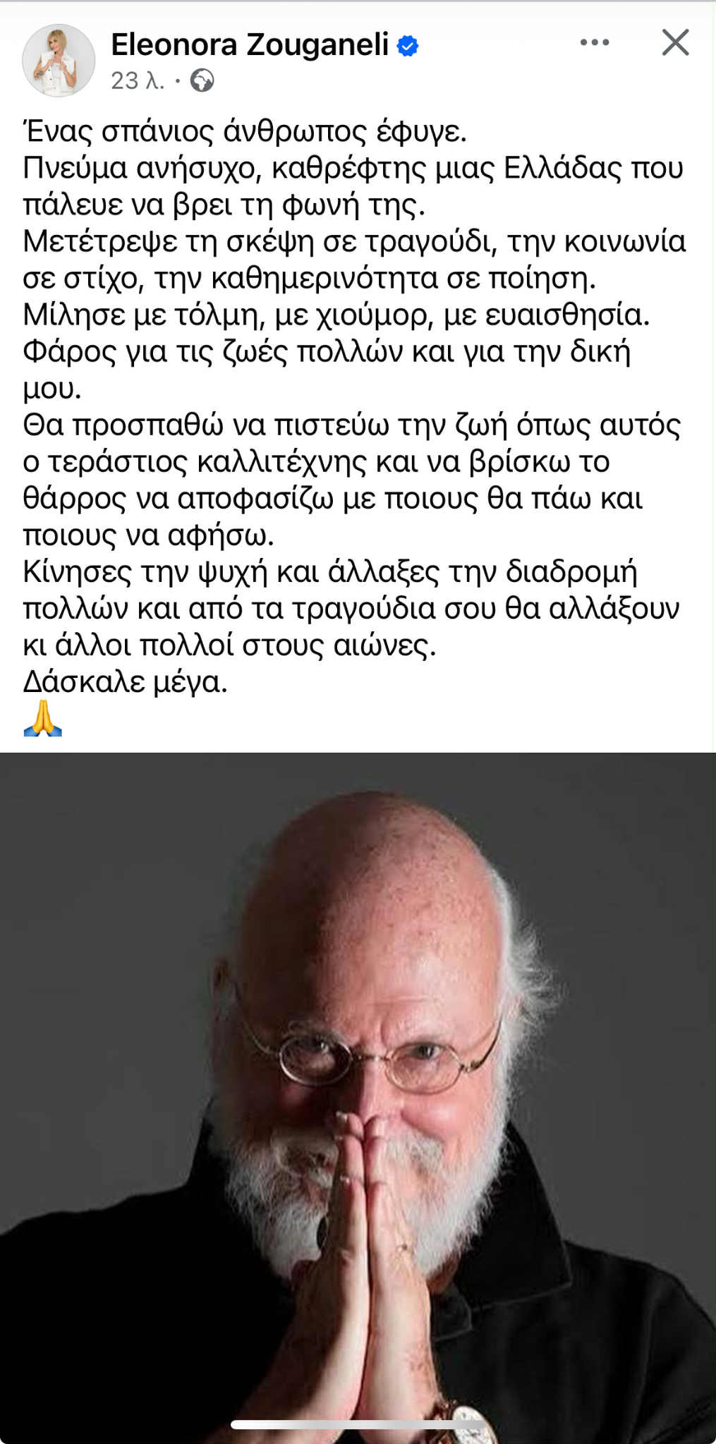 Πώς αποχαιρετούν 20 γνωστοί καλλιτέχνες -κάποιοι εκ των οποίων τεράστιοι- τον σπουδαίο Έλληνα τραγουδοποιό.