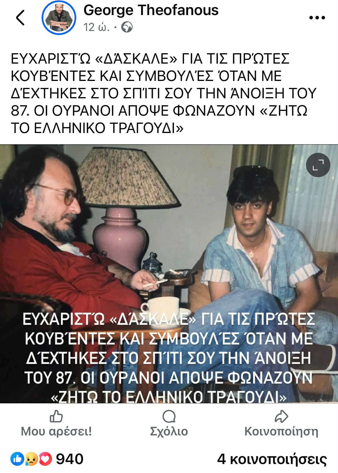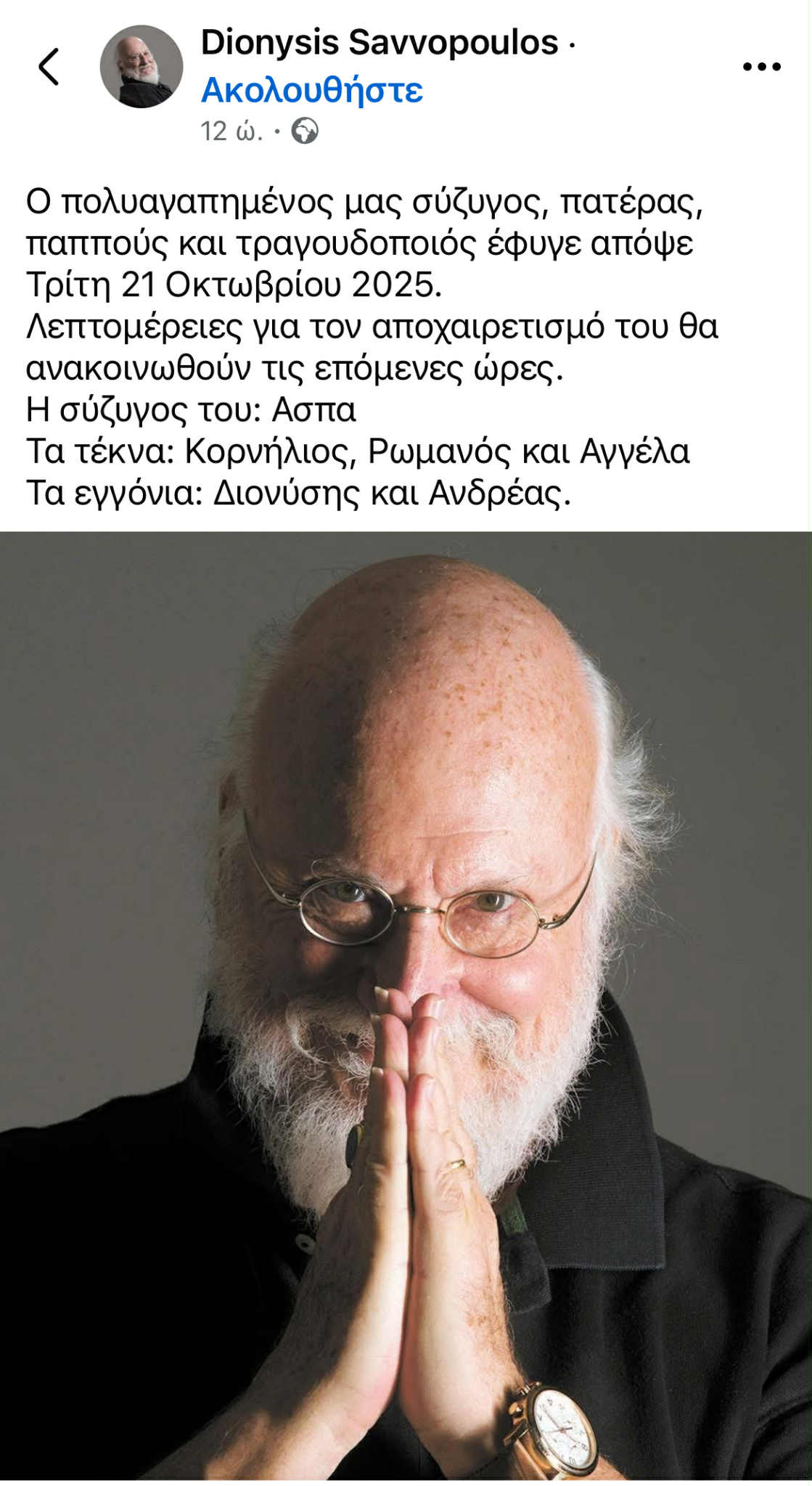 Ένας από τους βασικούς διαμορφωτές της σύγχρονης ελληνικής μουσικής, με καλλιτεχνική πορεία που απλώνεται σε έξι ολόκληρες δεκαετίες, έφυγε το βράδυ της Τρίτης 21 Οκτωβρίου 2025, σε ηλικία 80 ετών.