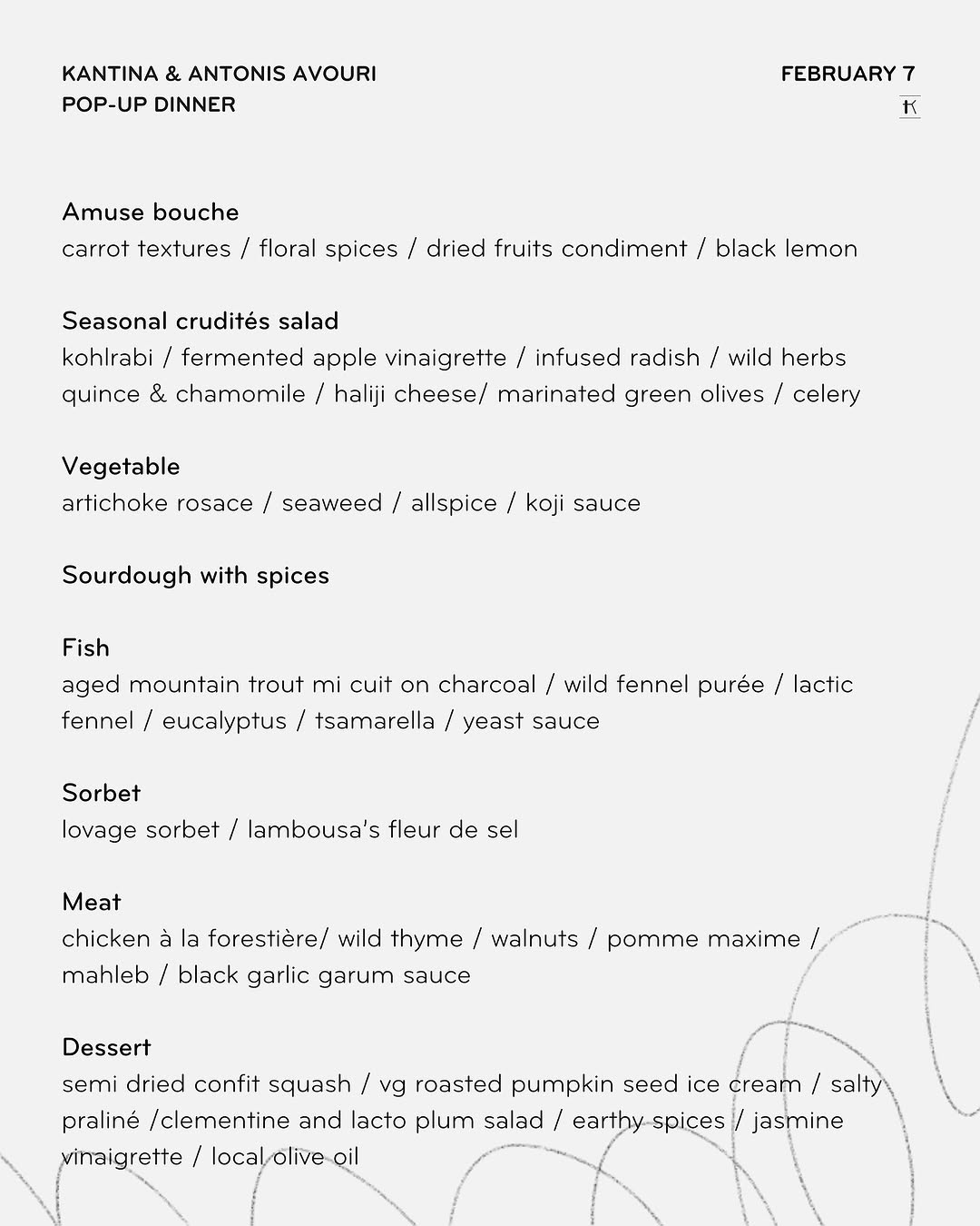Σπουδαία τα νέα, εξ ου και τα μοιραζόμαστε μαζί σας. Αγαπώντας την εντοπιότητα και την εποχικότητα, αλλά και έχοντας πάντα σκανδιναβικές και γαλλικές επιρροές στη μαγειρική του, ειδικά για το προσεχές dinner έφτιαξε ένα special μενού (δείτε παρακάτω), το οποίο θα συνοδεύεται από wine pairing με κρασιά από τη συλλογή του Kantina.