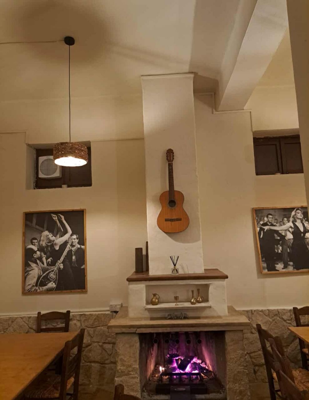 Ο προαύλιος χώρος με τις μεγάλες τζαμαρίες που αφήνει όλο το φως να εισβάλει στο εστιατόριο, το πλακόστρωτο εσωτερικό, η πέτρα στον τοίχο με το χαρακτηριστικό λευκό της περιοχής, αλλά και το τζάκι που όλο τον χειμώνα θα σιγοκαίει προσφέροντας τη ζεστασιά του στους παρευρισκόμενους, δημιουργούν ένα υπέροχο σκηνικό, παραπέμποντας σε εικόνες άλλων εποχών.