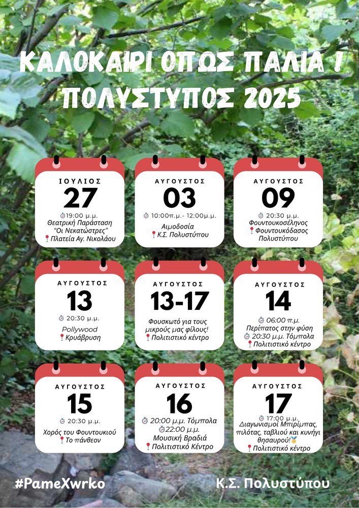 Συνεχής ενημέρωση για τις εκδηλώσεις στις σελίδες Κοινοτικό Συμβούλιο Πολυστύπου και Πολιτιστικό Σωματείο "Ορίζοντες" Πολυστύπου