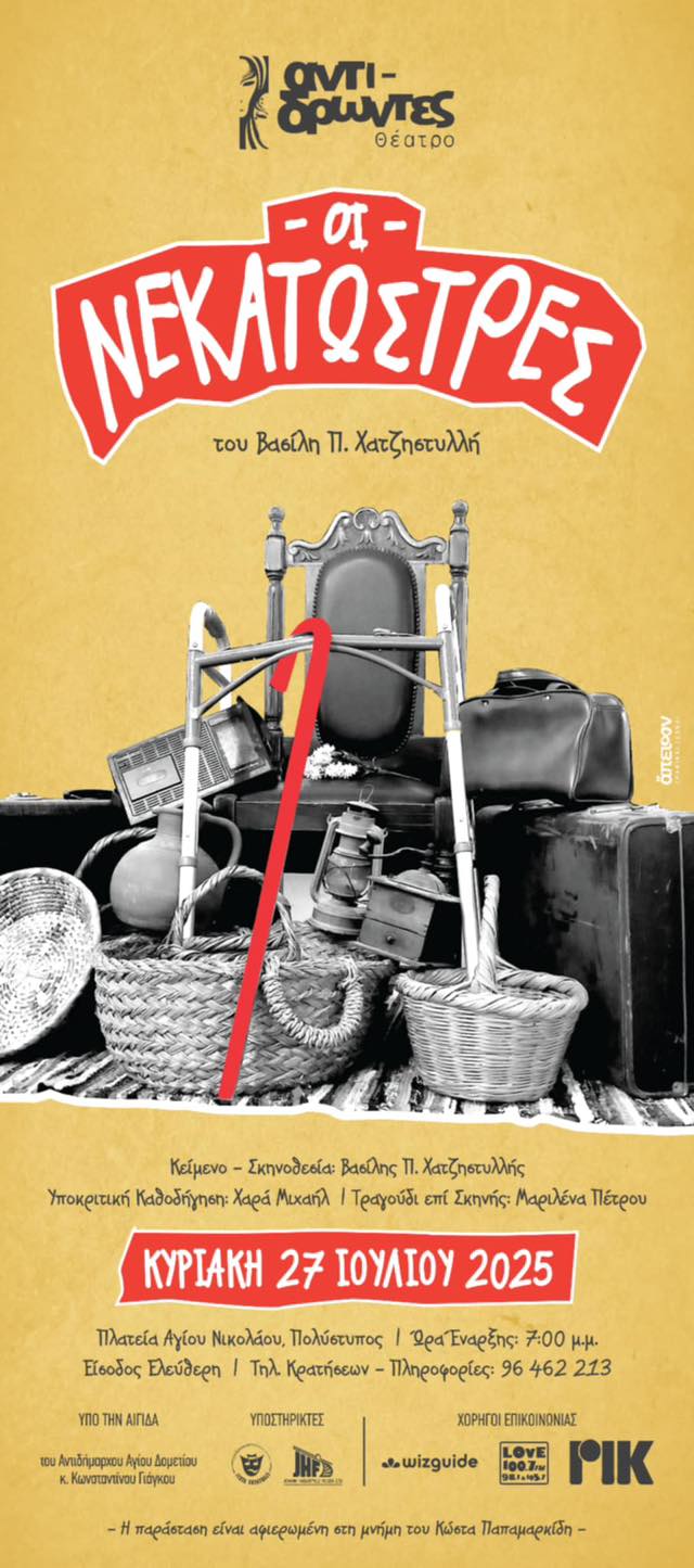 Η αρχή θα γίνει την Κυριακή 27 Ιουλίου, με τη θεατρική παράσταση «Οι Νεκατώστρες», στην Πλατεία Αγίου Νικολάου. Πρόκειται για το καινούργιο έργο του Βασίλη Π. Χατζηστυλλή, σε σκηνοθεσία του ίδιου, που ανεβαίνει από την πολυβραβευμένη Θεατρική Ομάδα Αντι-Δρώντες. Πρόκειται για ένα ιδιαίτερα τρυφερό κοινωνικό έργο για την τρίτη ηλικία, γραμμένο στην κυπριακή διάλεκτο, με κωμικές στιγμές και νοσταλγική συγκίνηση, καθότι πραγματεύεται τη σχέση γονέων και παιδιών, όταν οι πρώτοι βρίσκονται πια σε μεγάλη ηλικία.