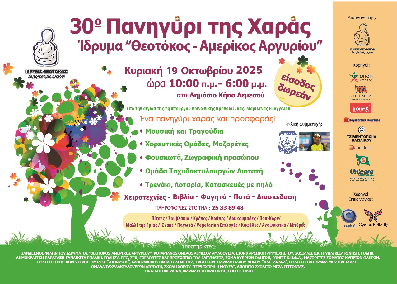 Το Πανηγύρι θα είναι στο Δημόσιο Κήπο Λεμεσού και τελεί υπό την αιγίδα της Υφυπουργού Κοινωνικής Πρόνοιας, κυρίας Μαριλένας Ευαγγέλου.